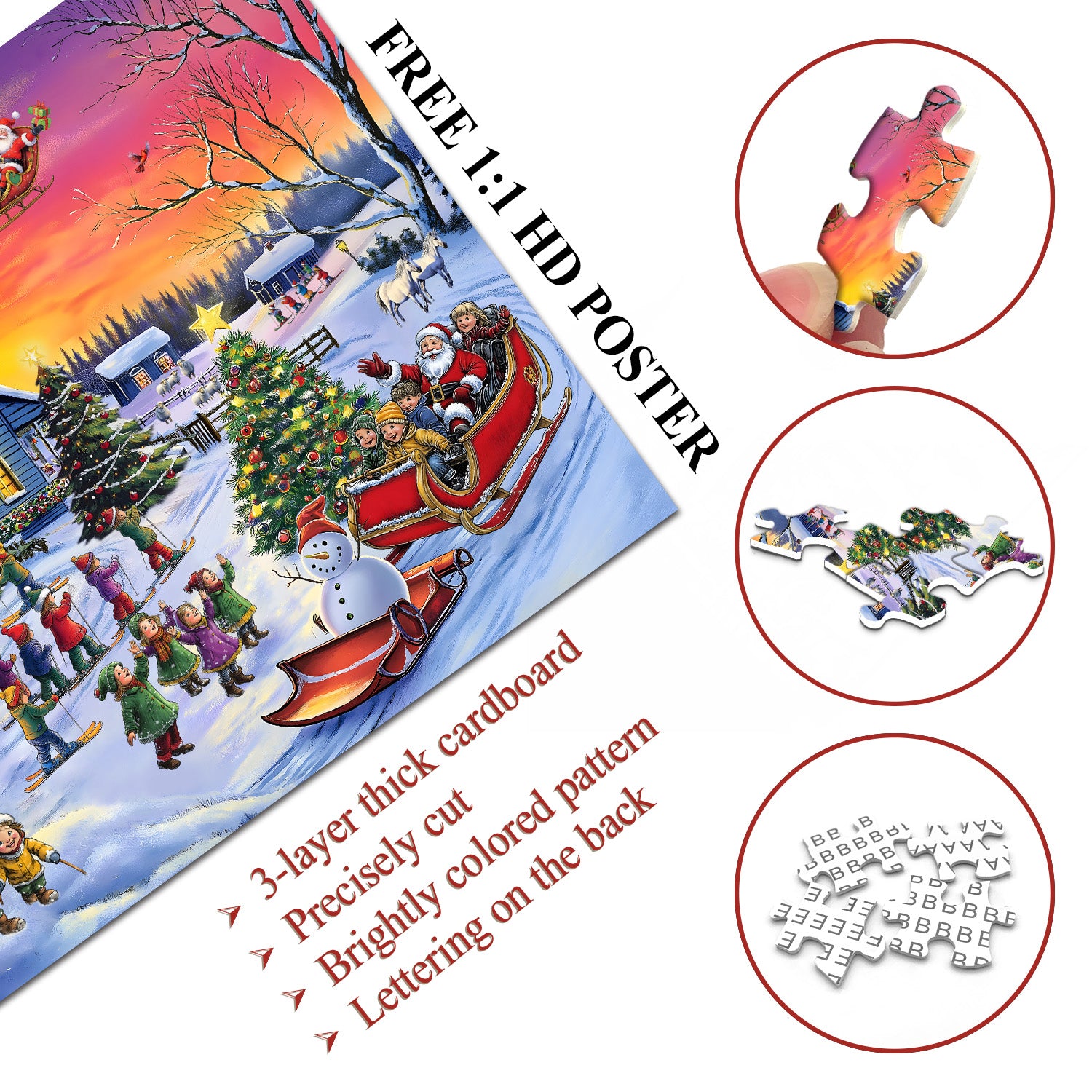 Lebendige und detaillierte Weihnachtsbilder: Die untergehende Sonne taucht die fröhliche Winterlandschaft in einen warmen Schein und trägt zur festlichen Atmosphäre bei. Jedes Puzzleteil enthüllt filigrane Weihnachtsdetails, von den spielenden Kindern bis zur aufgeregten Menge, und erweckt so die Weihnachtsstimmung zum Leben.