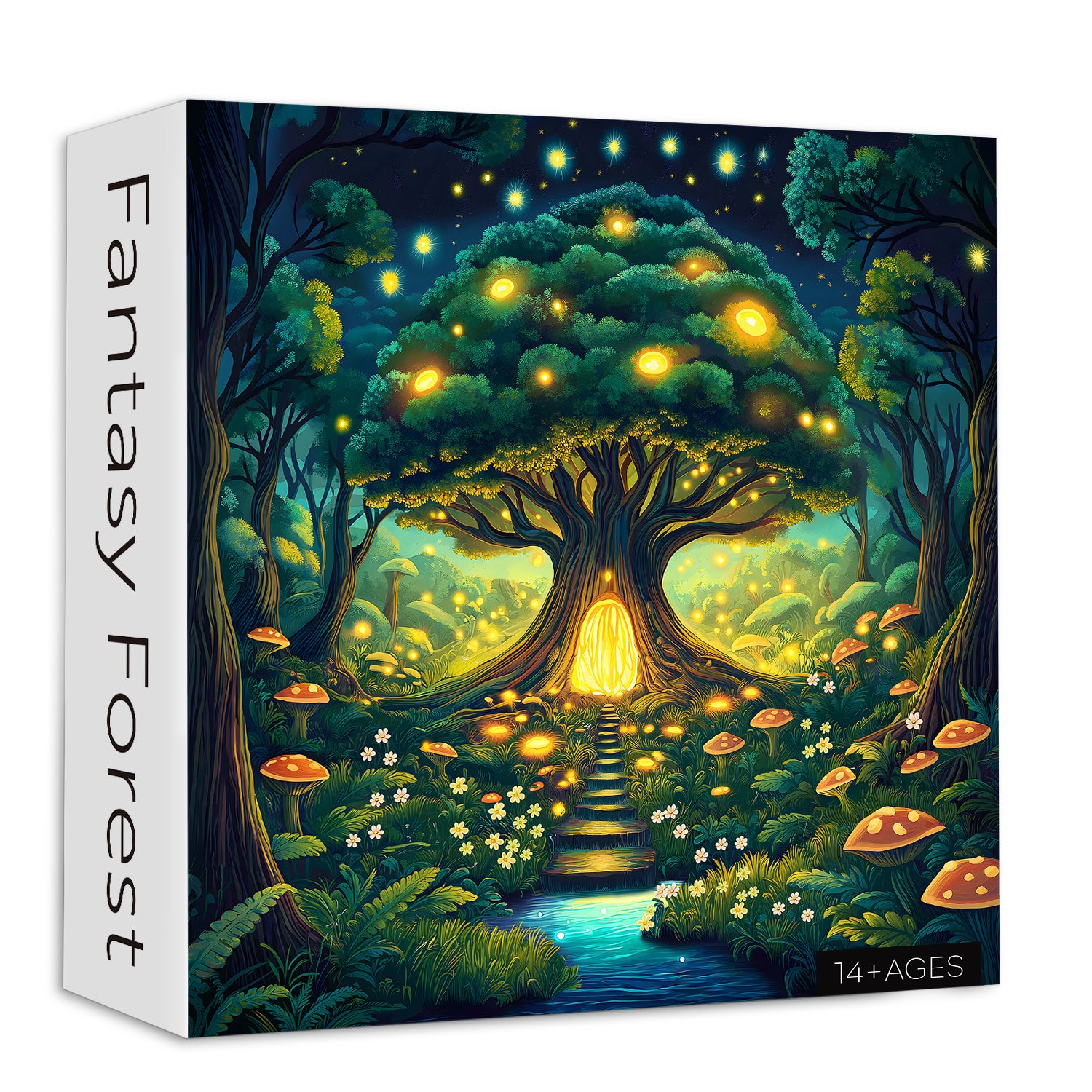 Ein magisches Waldabenteuer: Betreten Sie ein verzaubertes Reich mit dem 1000-teiligen Puzzle „Fantasiewald“. Diese faszinierende Illustration zeigt einen lebendigen, wunderlichen Wald voller üppiger grüner Bäume, leuchtender Pilze und Glühwürmchen, die die Nacht erhellen. Im Mittelpunkt der Szene steht ein majestätischer Baum mit einer leuchtend gelben Laterne in seinem Stamm, die ein warmes, magisches Licht über den Wald wirft. Die detailreichen Details entführen Sie in eine traumhafte Welt voller Geheimnisse und Charme.