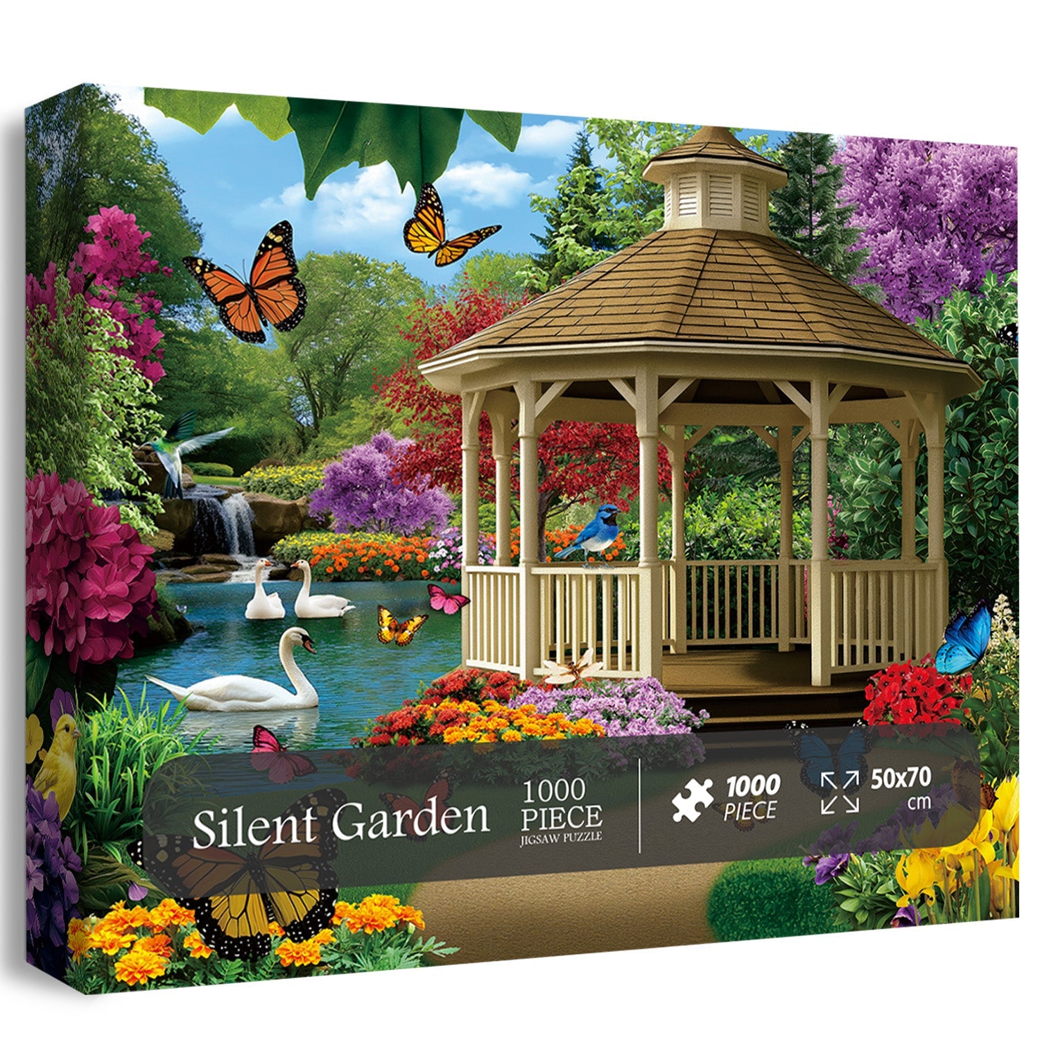 Bezaubernder Pavillon : Das Herzstück ist ein wunderschön gestalteter Pavillon, umgeben von einer leuchtenden Vielfalt farbenfroher Blumen in voller Blüte.