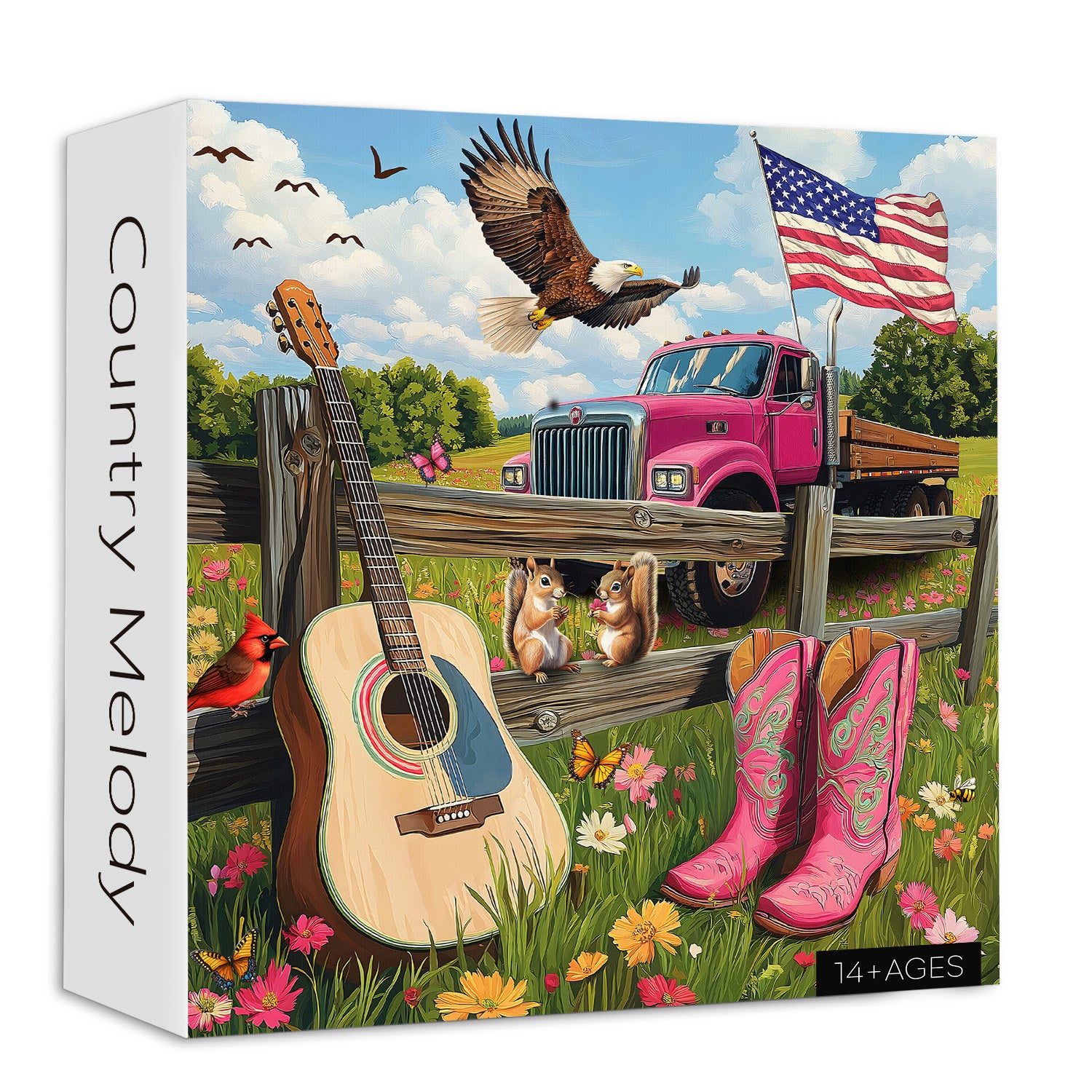 Ein Lied der Landschaft. Erfassen Sie das Herz der amerikanischen Kultur mit dieser lebendigen, musikgefüllten Szene mit einem rosafarbenen Pickup, einer Akustikgitarre, Wildblumen und Wildtieren in perfekter Harmonie.