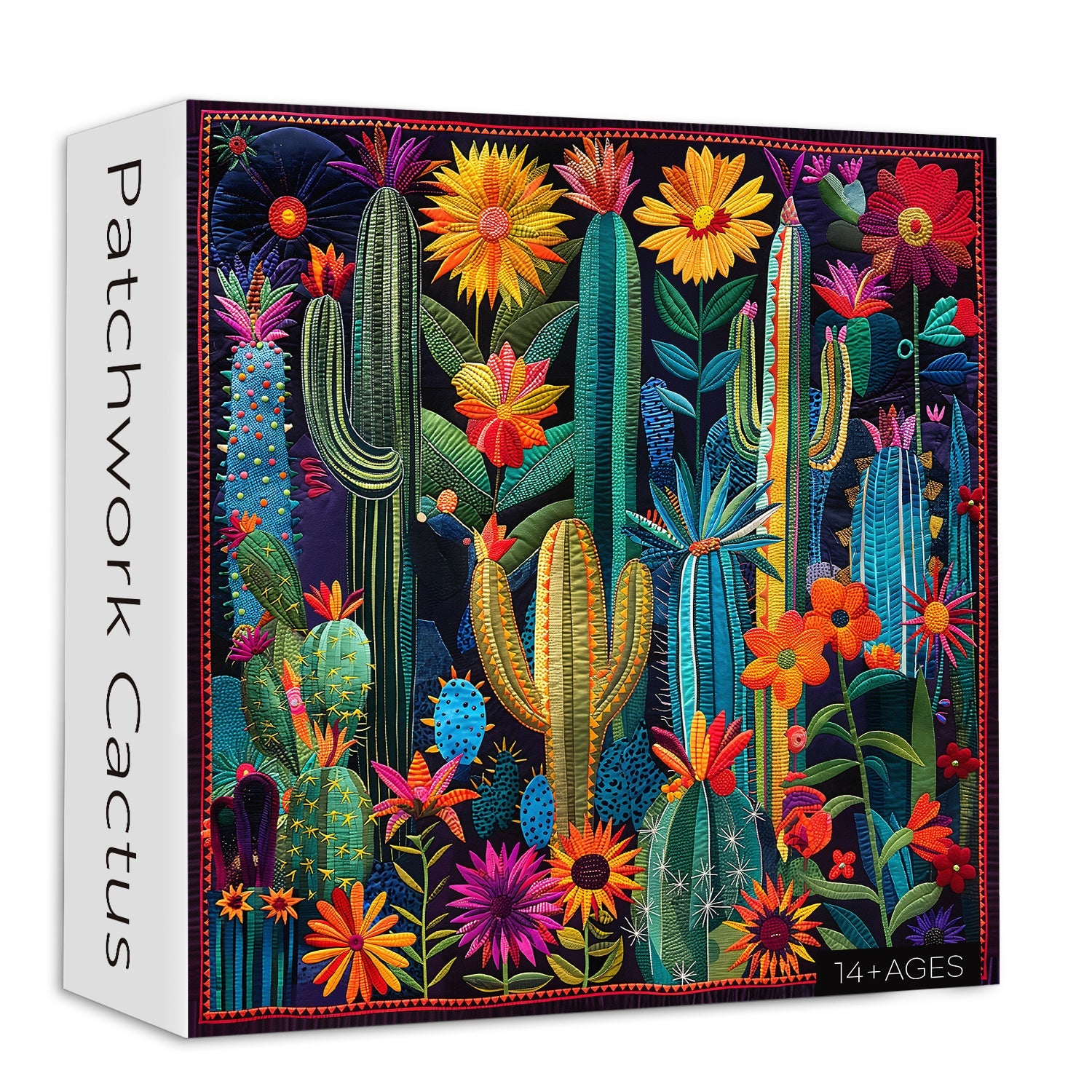 Artisanat Textile Complexe: Montre des techniques détaillées de broderie ou de matelassage qui donnent aux cactus et aux fleurs une apparence riche et texturée, renforçant la profondeur visuelle.