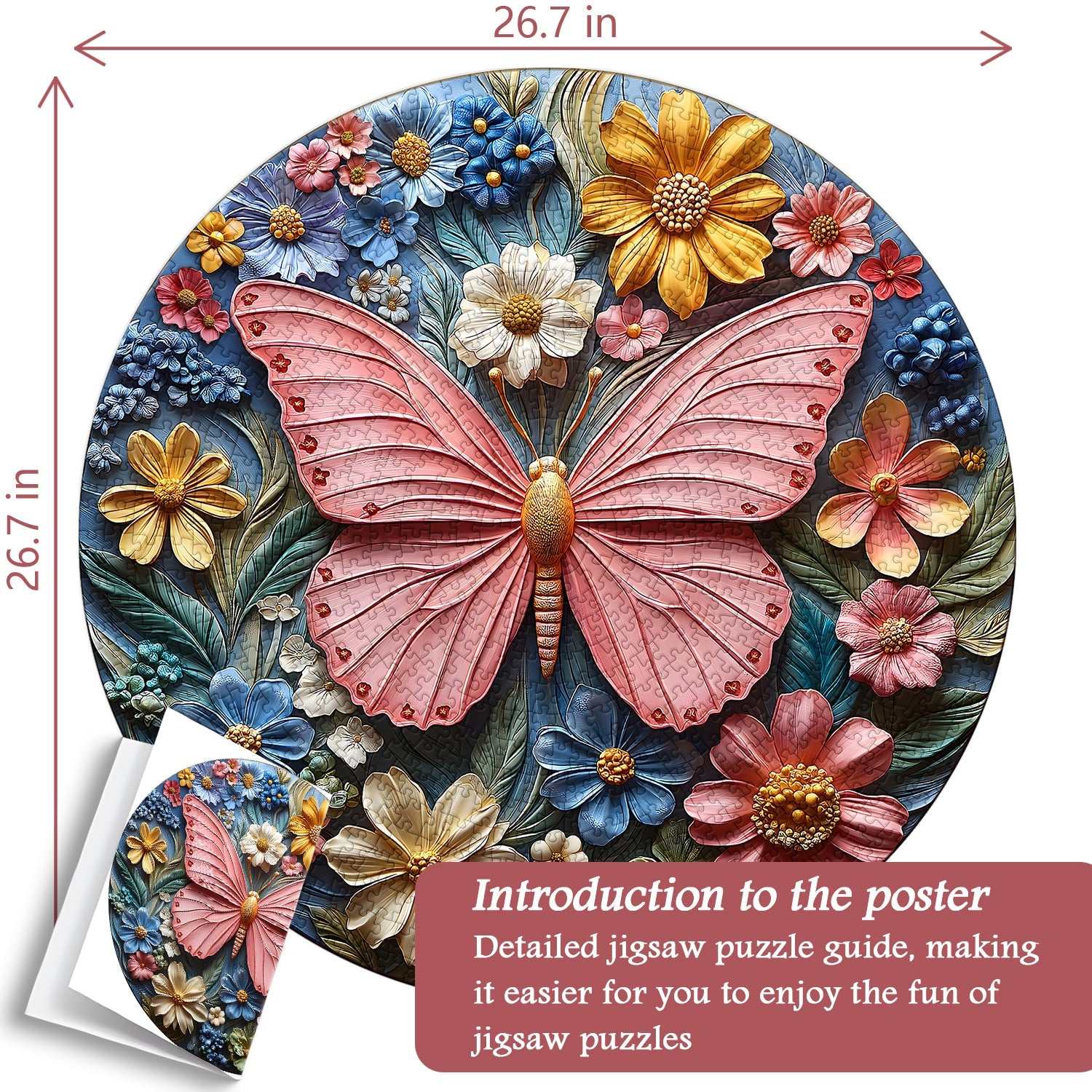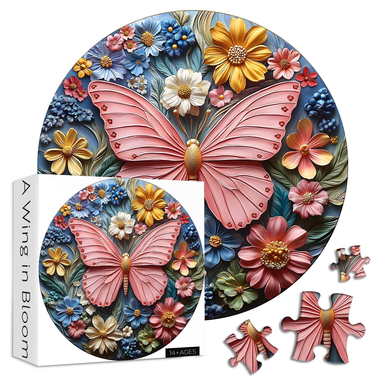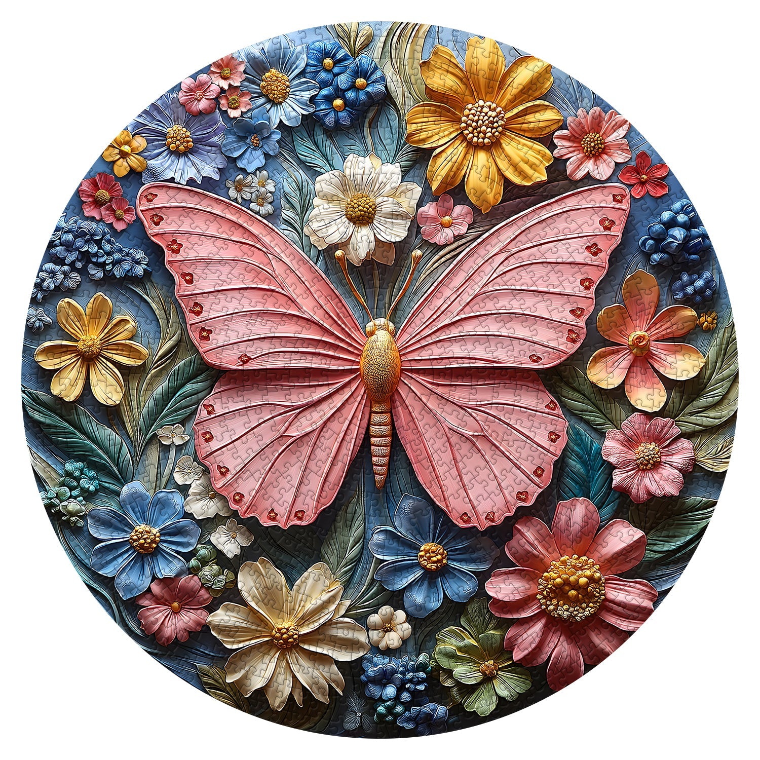 Atemberaubendes 3D-Design: Dieses Puzzle mit einem leuchtenden Schmetterling, umgeben von bunten Blumen in einem kreisförmigen, 3D-geprägten Tonkunstdesign, erweckt die Natur zum Leben.