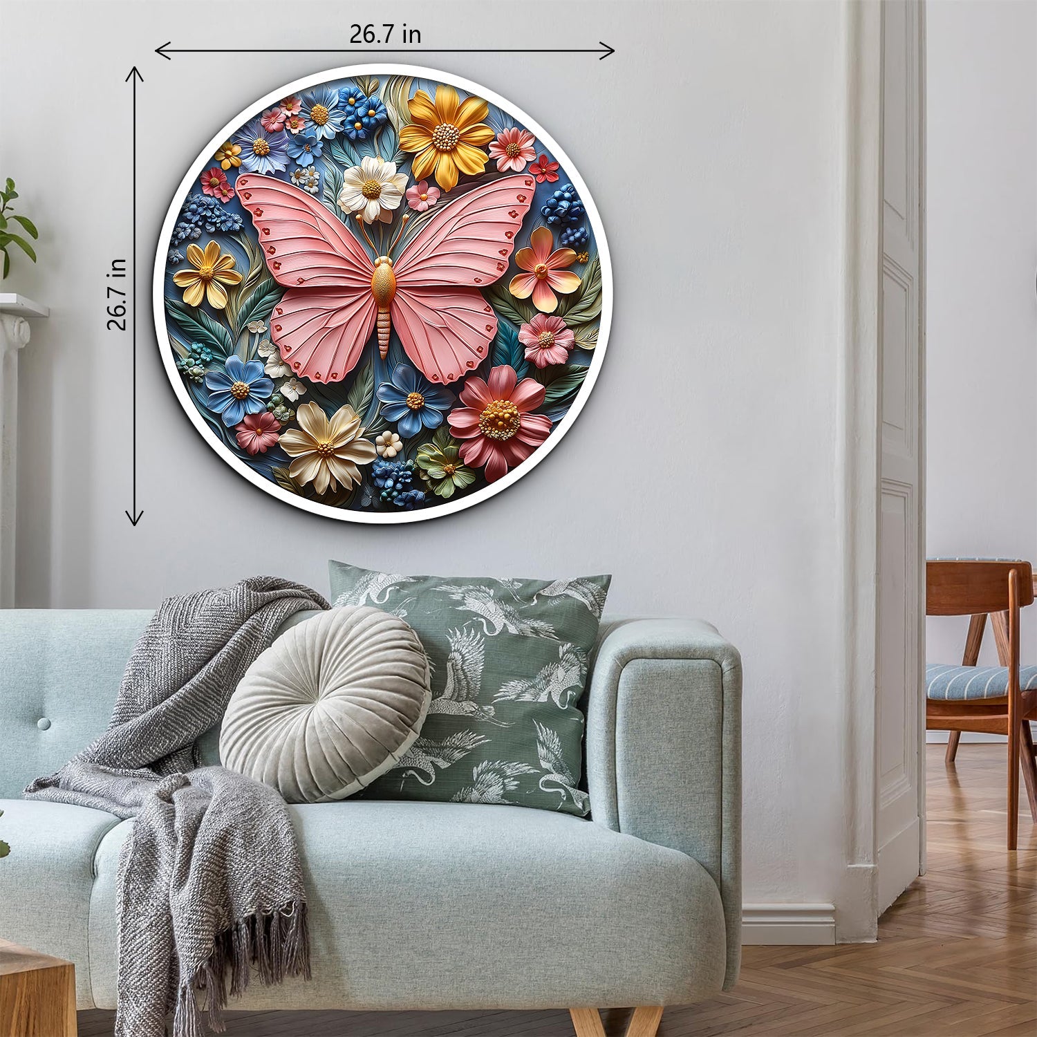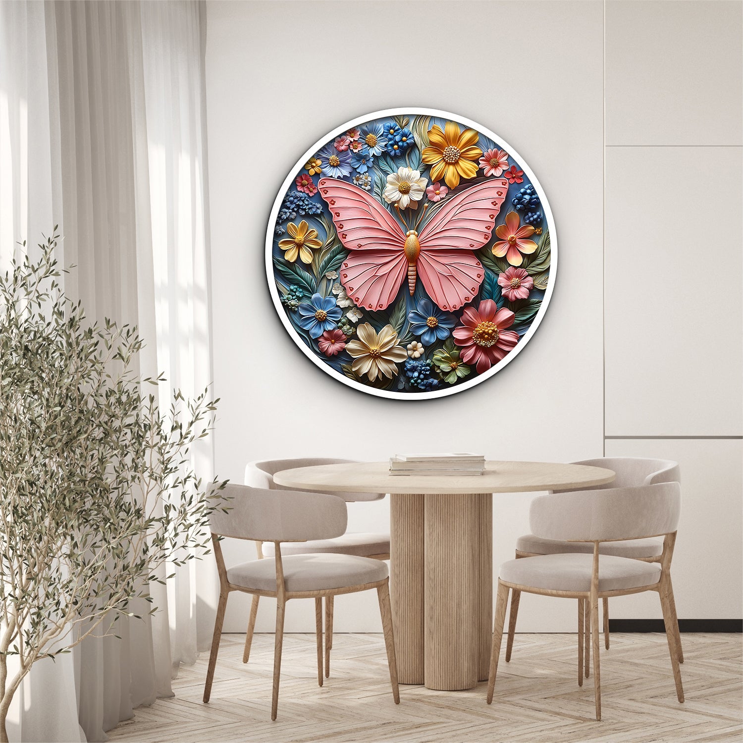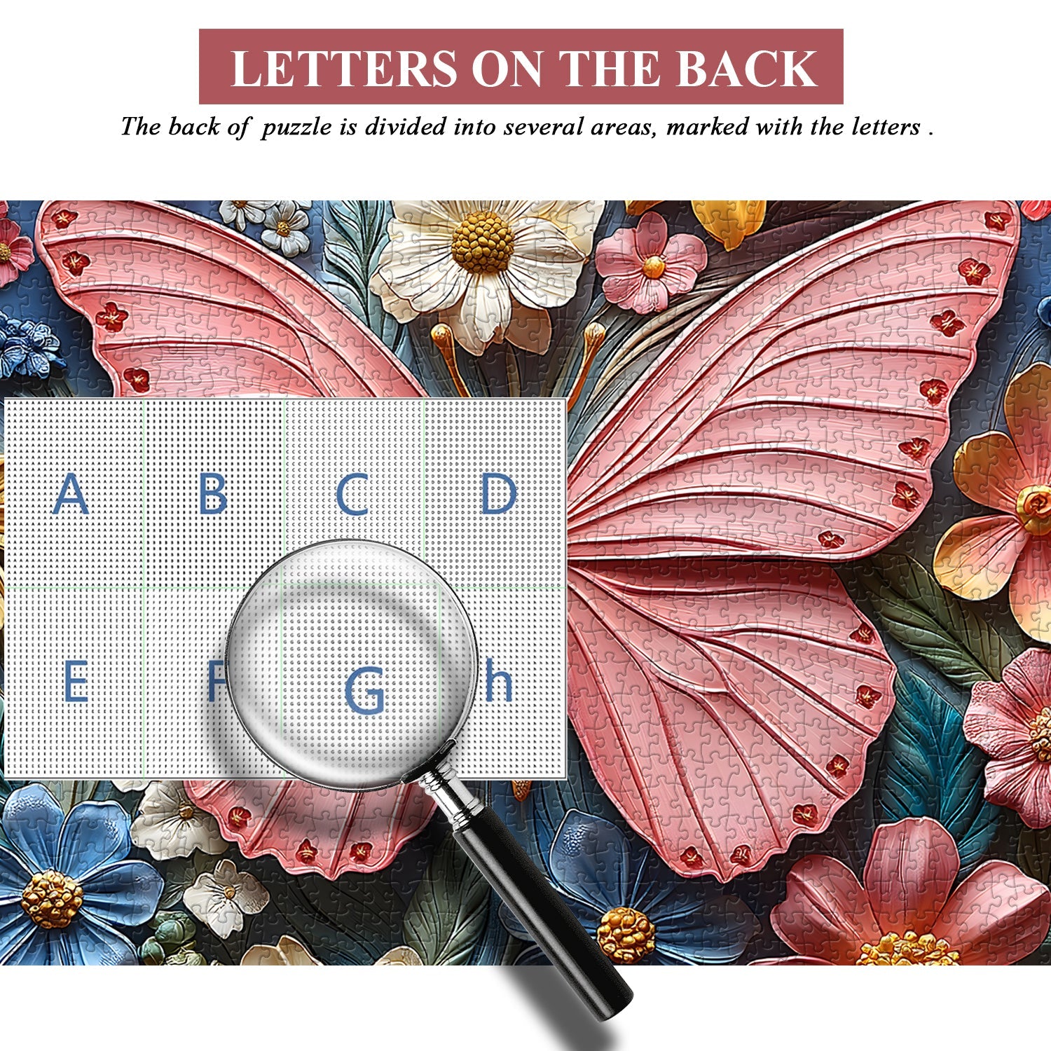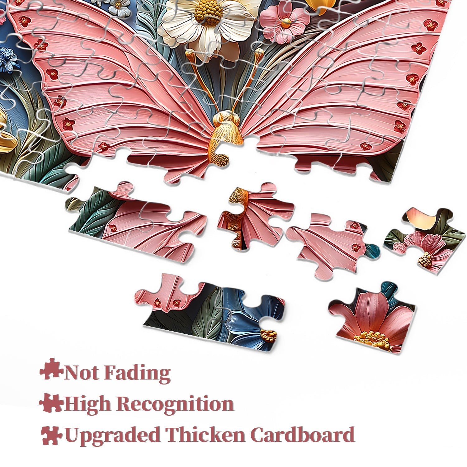 Atemberaubendes 3D-Design: Dieses Puzzle mit einem leuchtenden Schmetterling, umgeben von bunten Blumen in einem kreisförmigen, 3D-geprägten Tonkunstdesign, erweckt die Natur zum Leben.