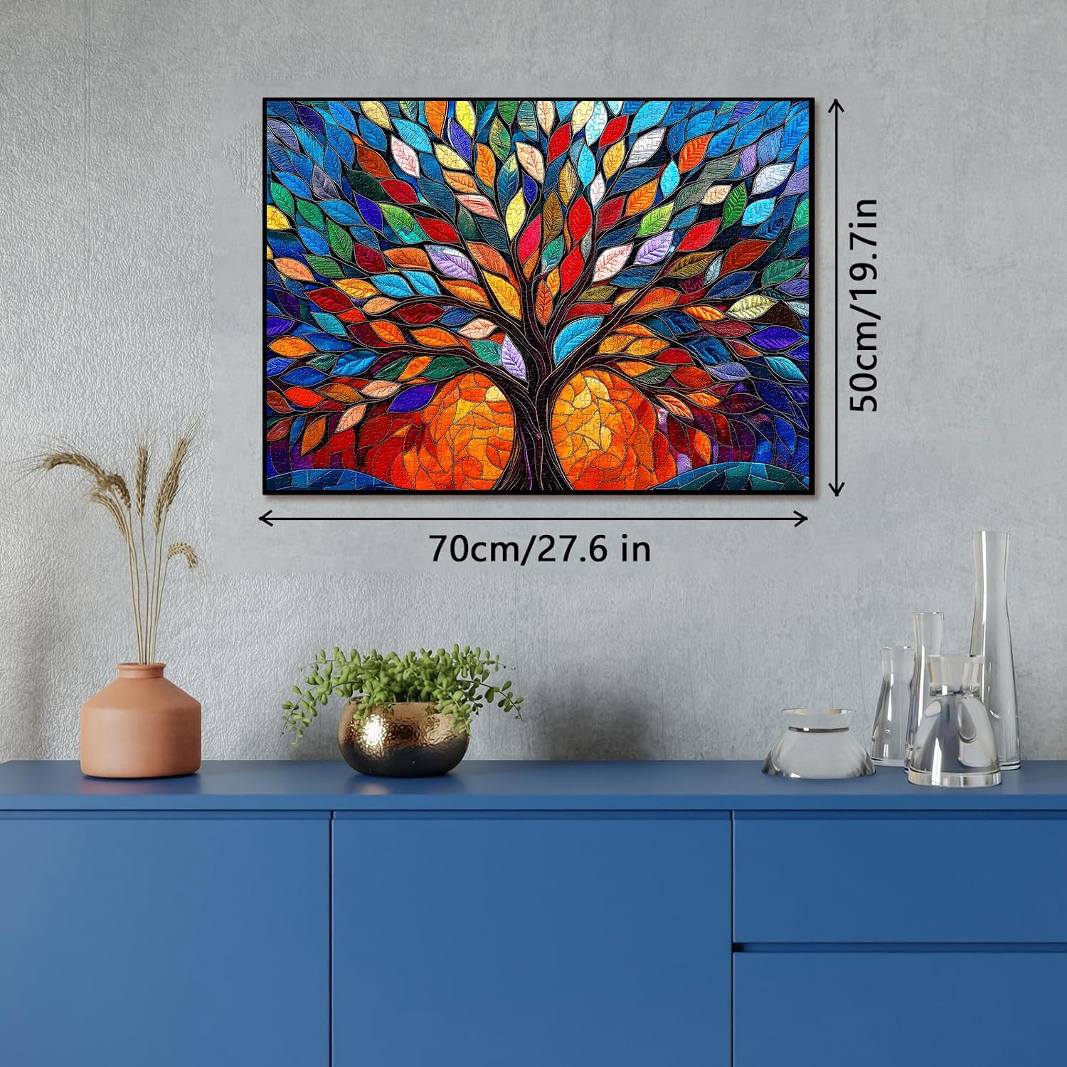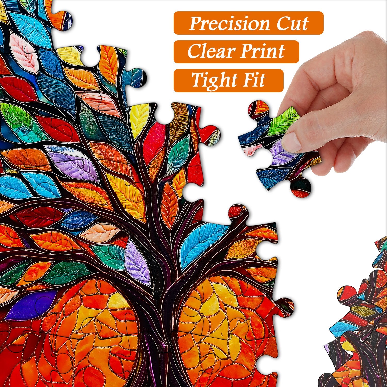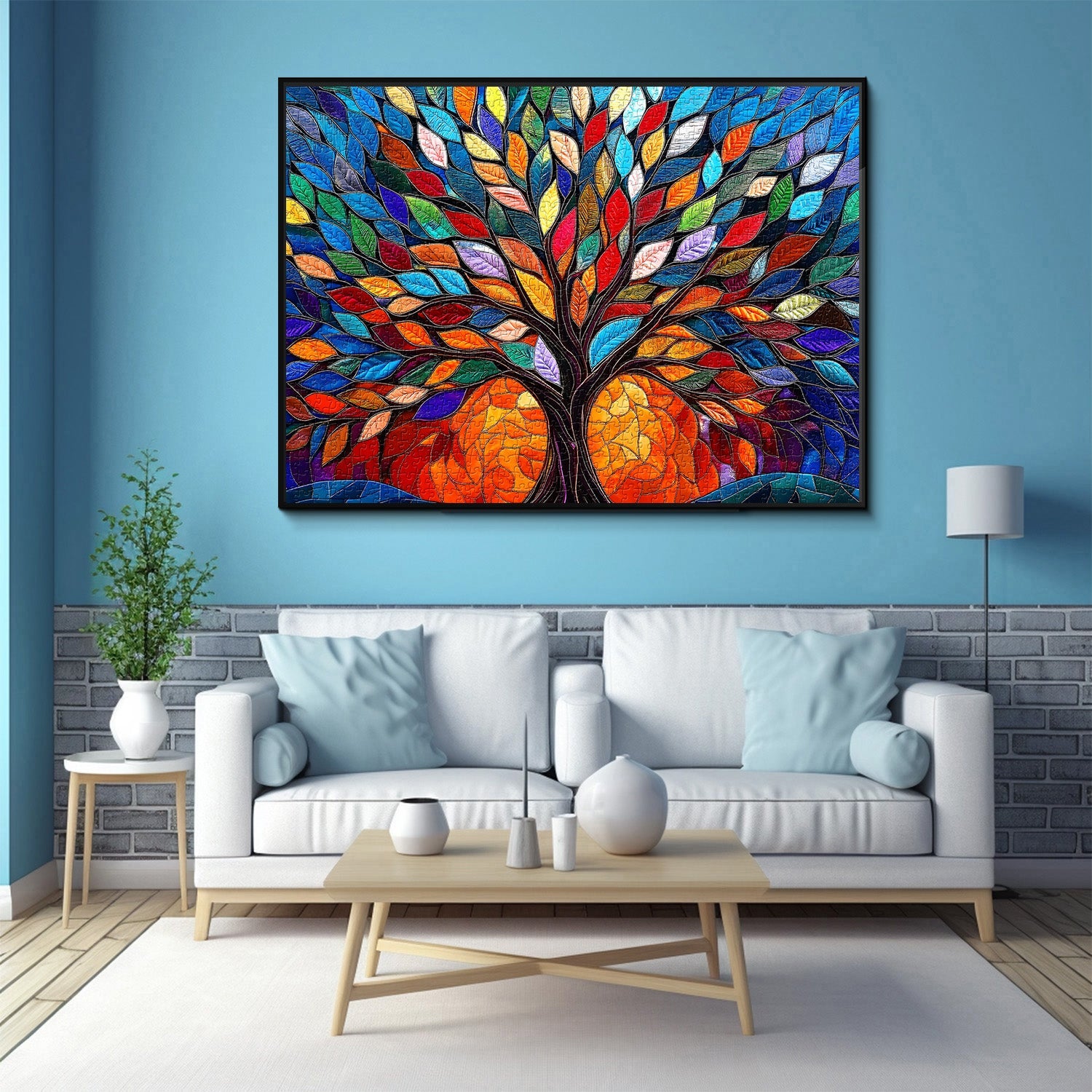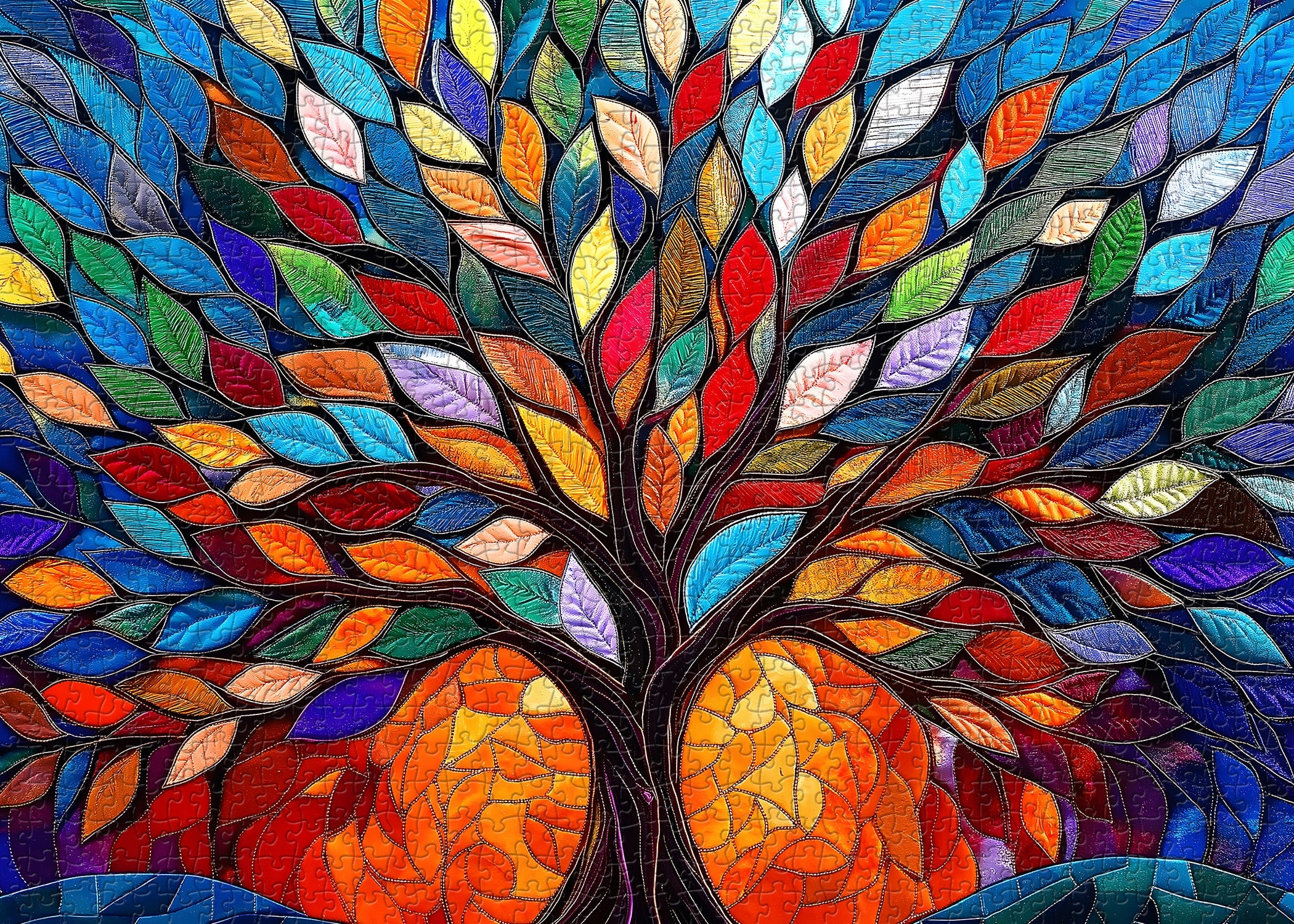 Vibrant Mosaic Style:The artwork features a stylized tree composed of brightly colored leaves and a trunk outlined in dark, defined borders, reminiscent of stained glass or mosaic art.