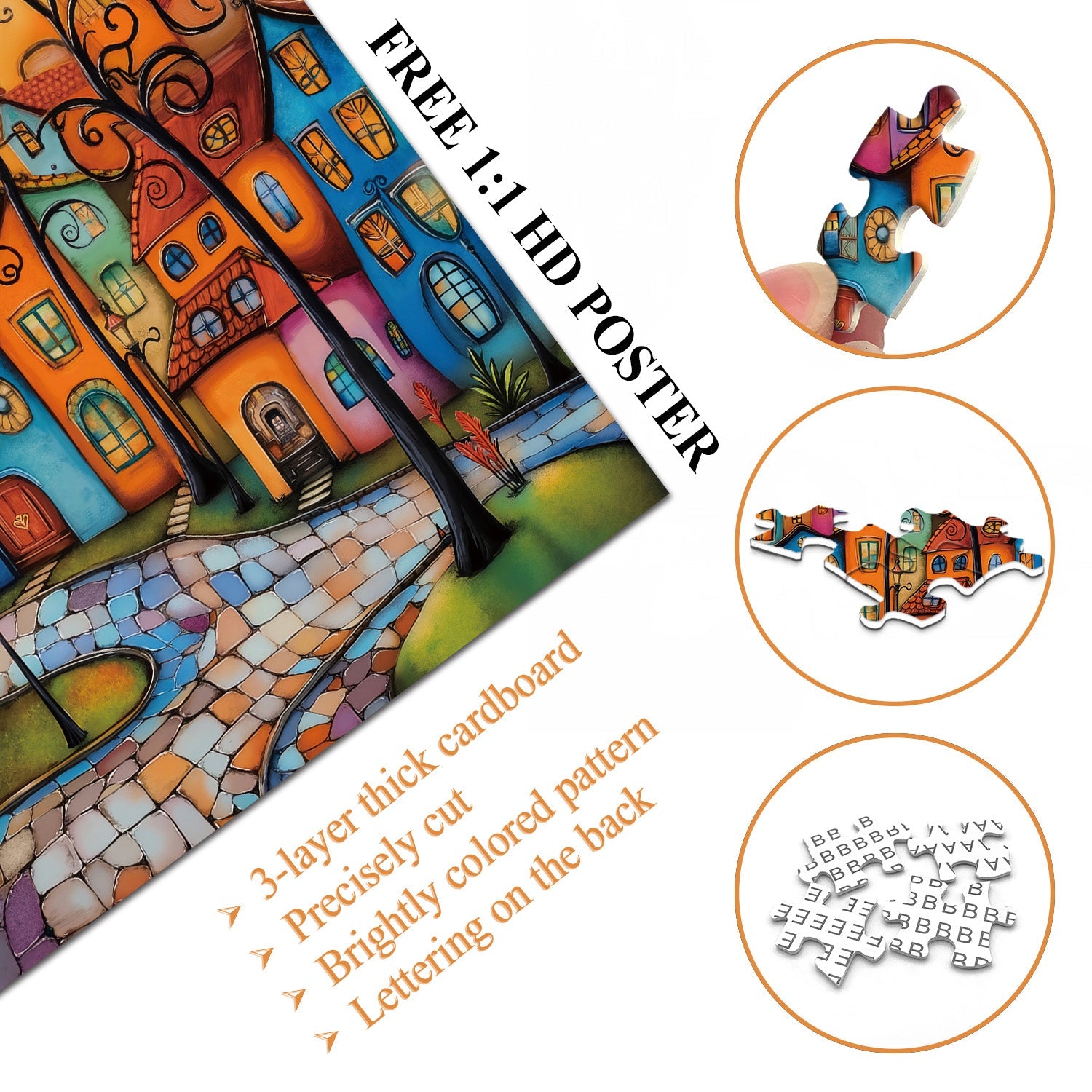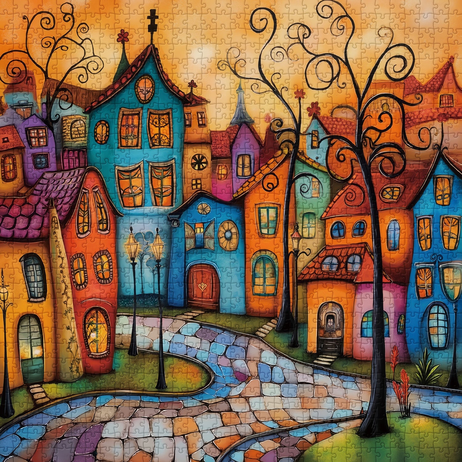 Vibrant Artwork: Full of bold colors and intricate details, the scene includes unique houses, swirling tree branches, and cobblestone paths for a visually captivating puzzle.