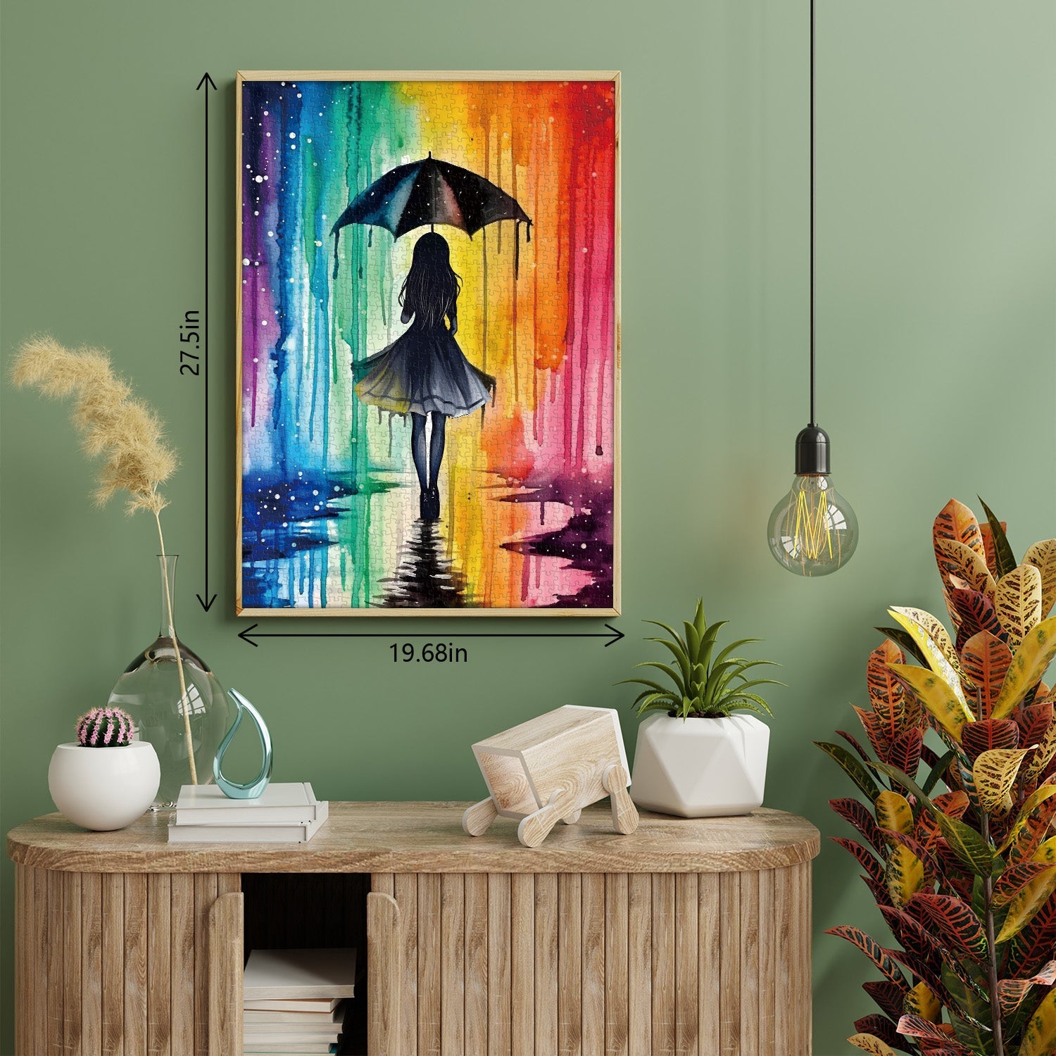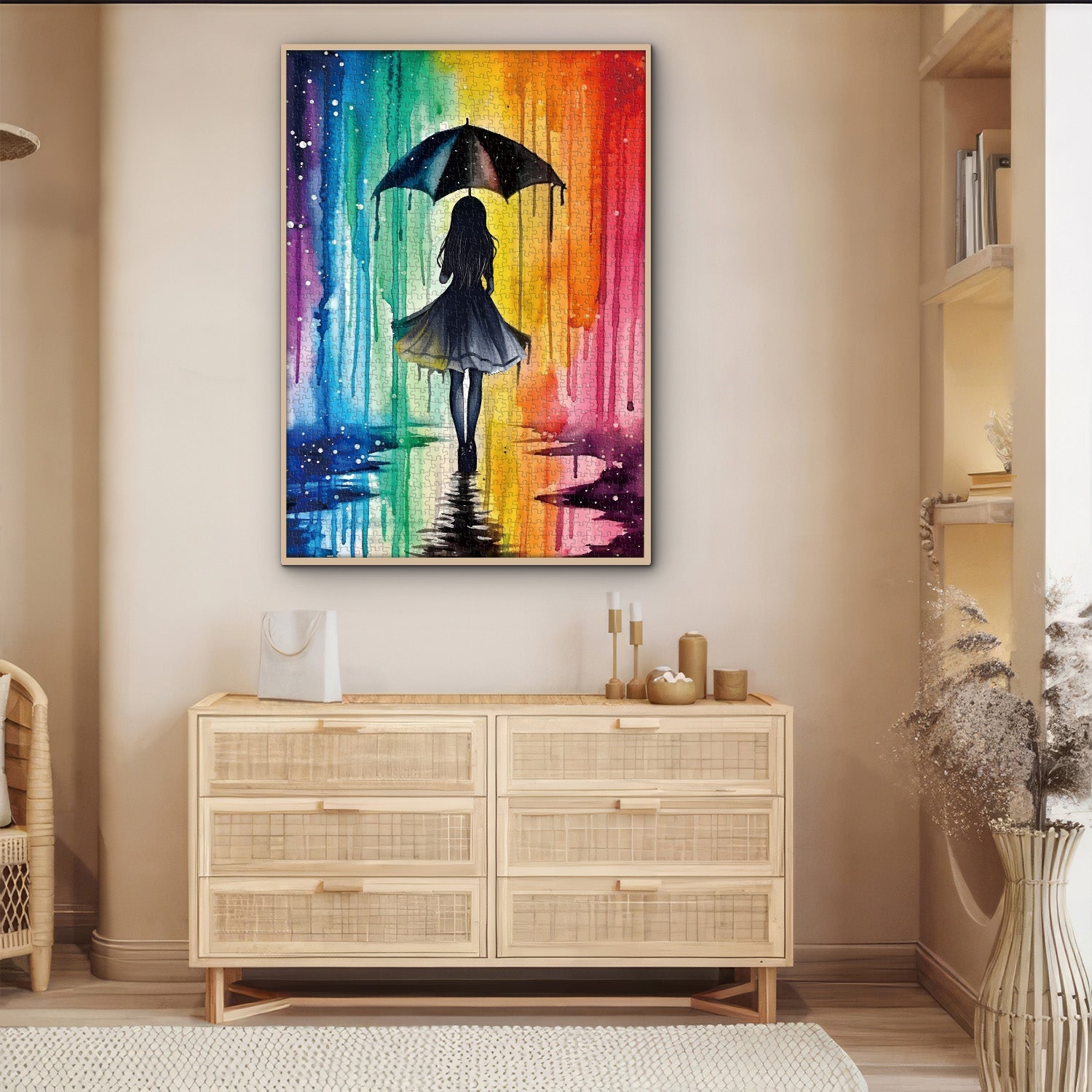 Regentropfen-Akzente: Regentropfen glitzern auf ihrem Haar und laufen ihre Beine hinunter, wodurch die Schönheit eines regnerischen Moments im komplizierten Puzzle-Art-Stil eingefangen wird.