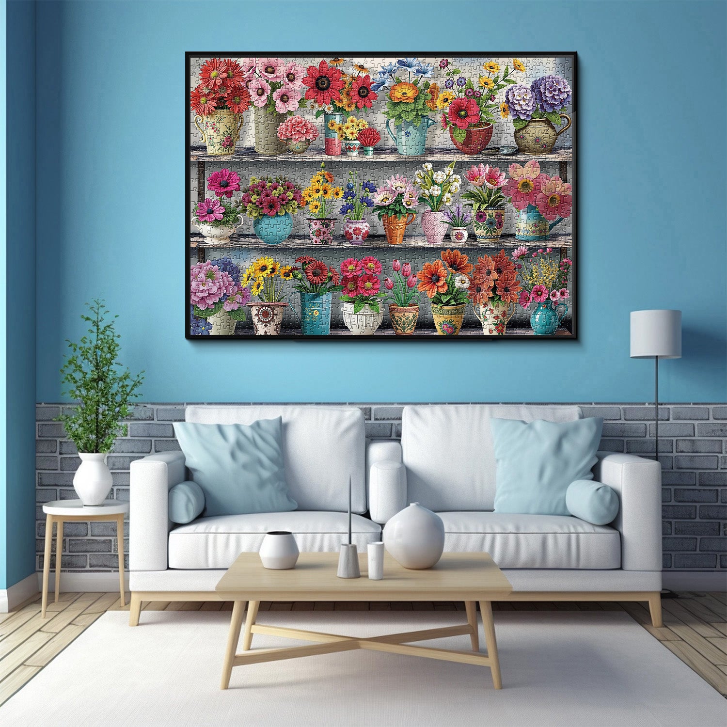 Exquisite Floral Artwork: Features a vibrant collage of blooming flowers in diverse colors—roses, sunflowers, daisies, and hydrangeas—arranged in vintage ceramic vases across three wooden shelves. Each petal and leaf is intricately detailed with watercolor-like gradients, creating a lifelike garden scene.
