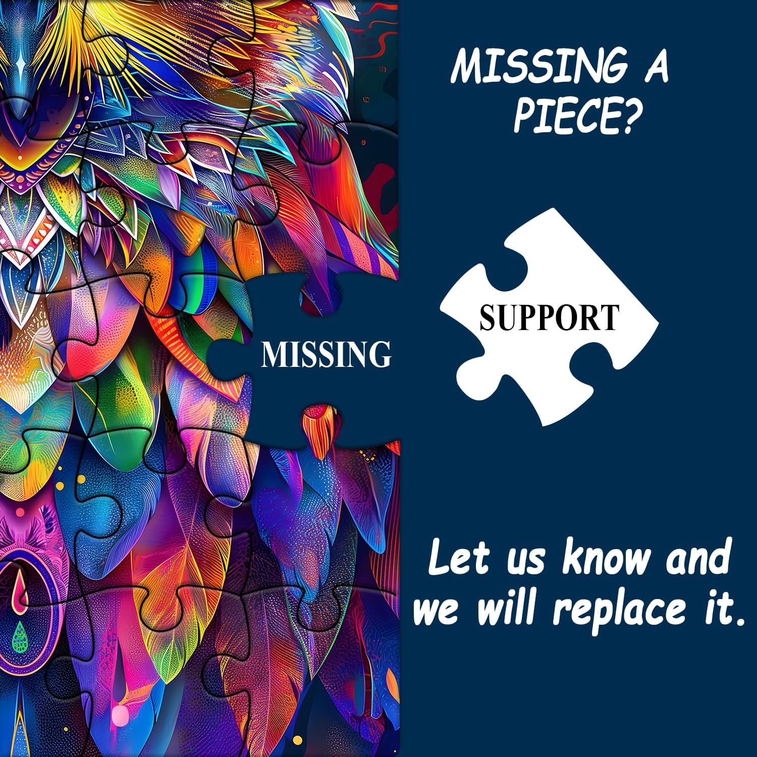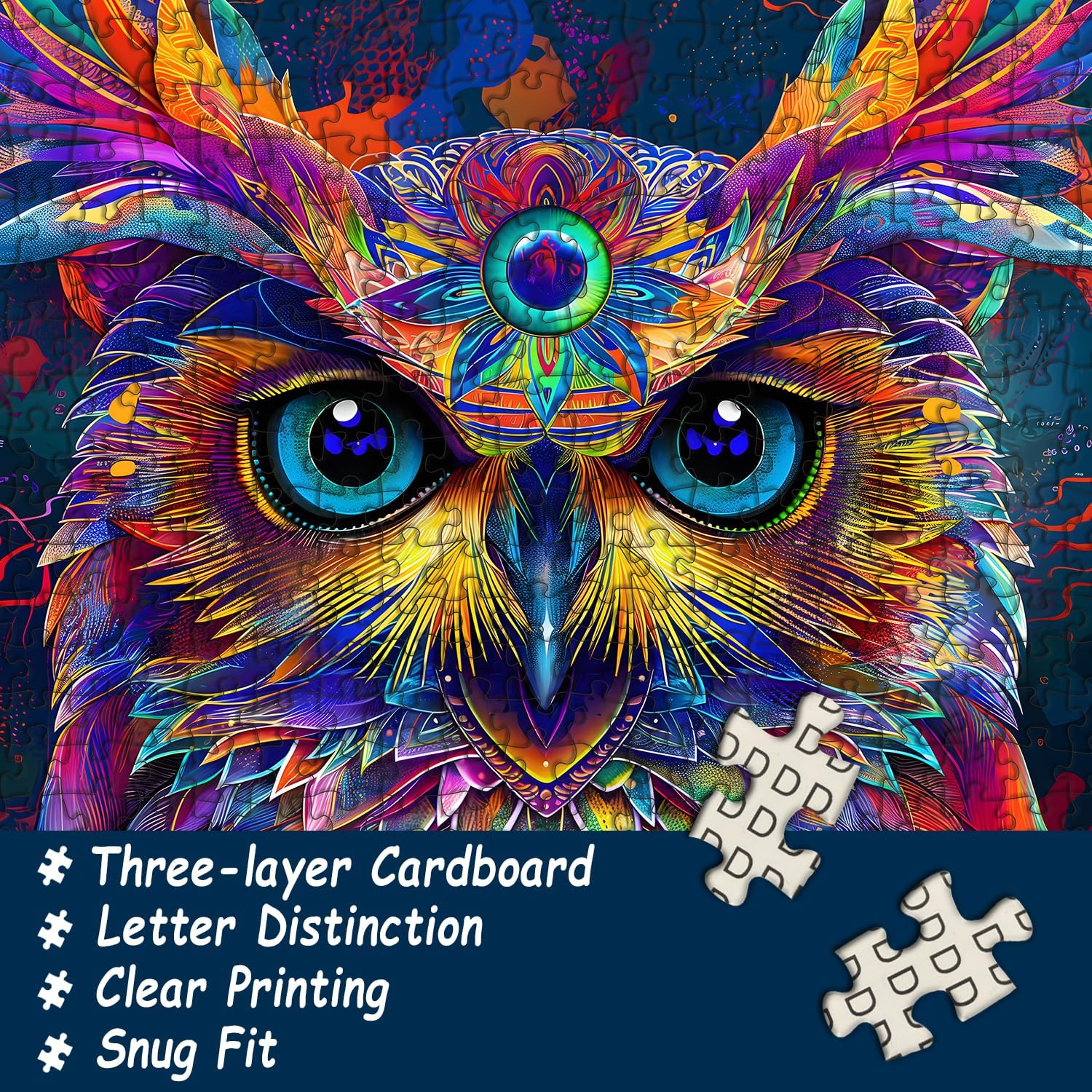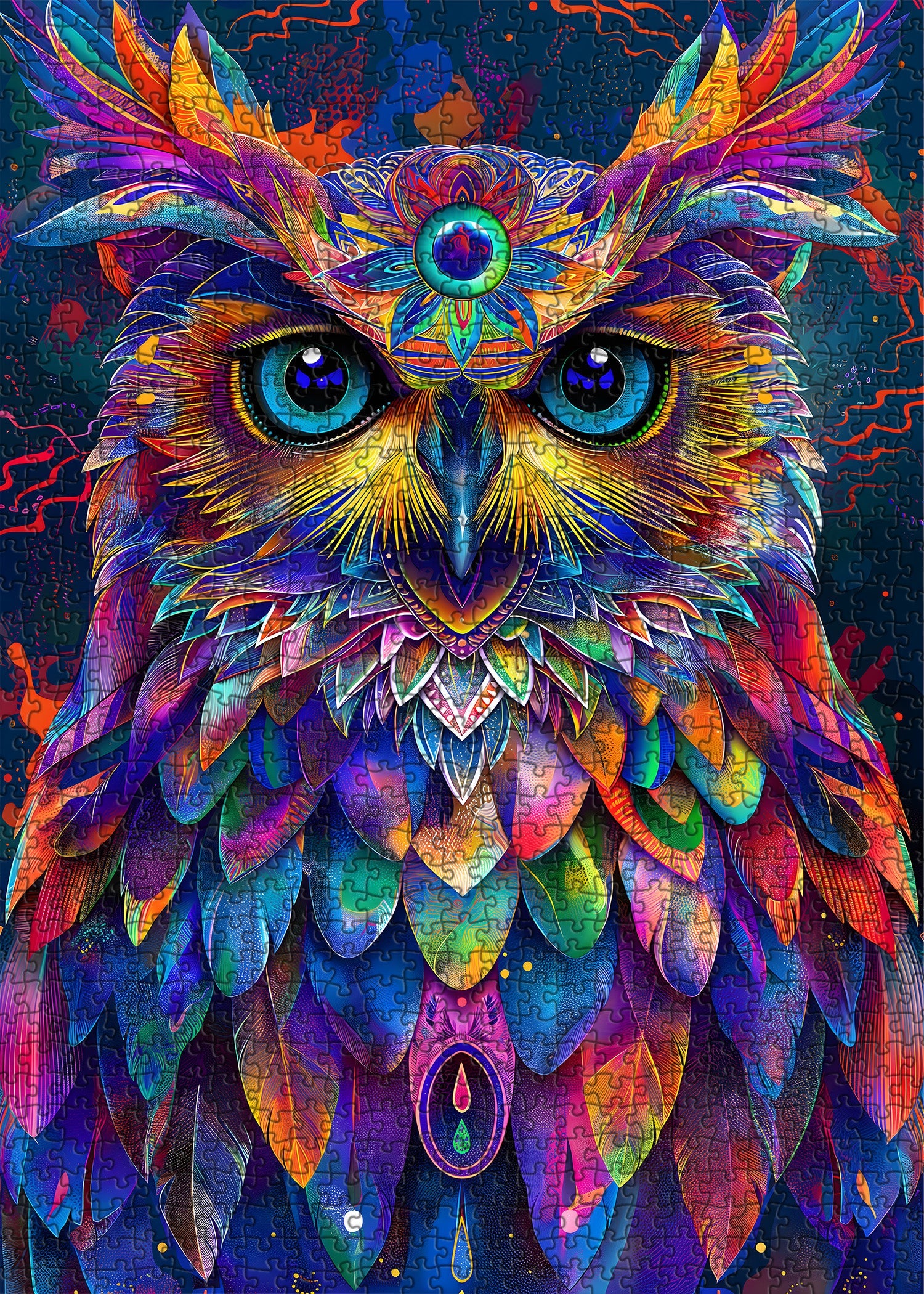Psychedelisches Eulendesign : Das Puzzle zeigt eine atemberaubende, lebendige Eule im psychedelischen Stil, die durch die Verwendung kräftiger, kontrastierender Farben ein auffälliges Bild erzeugt, das vor Energie und Leben strotzt.
