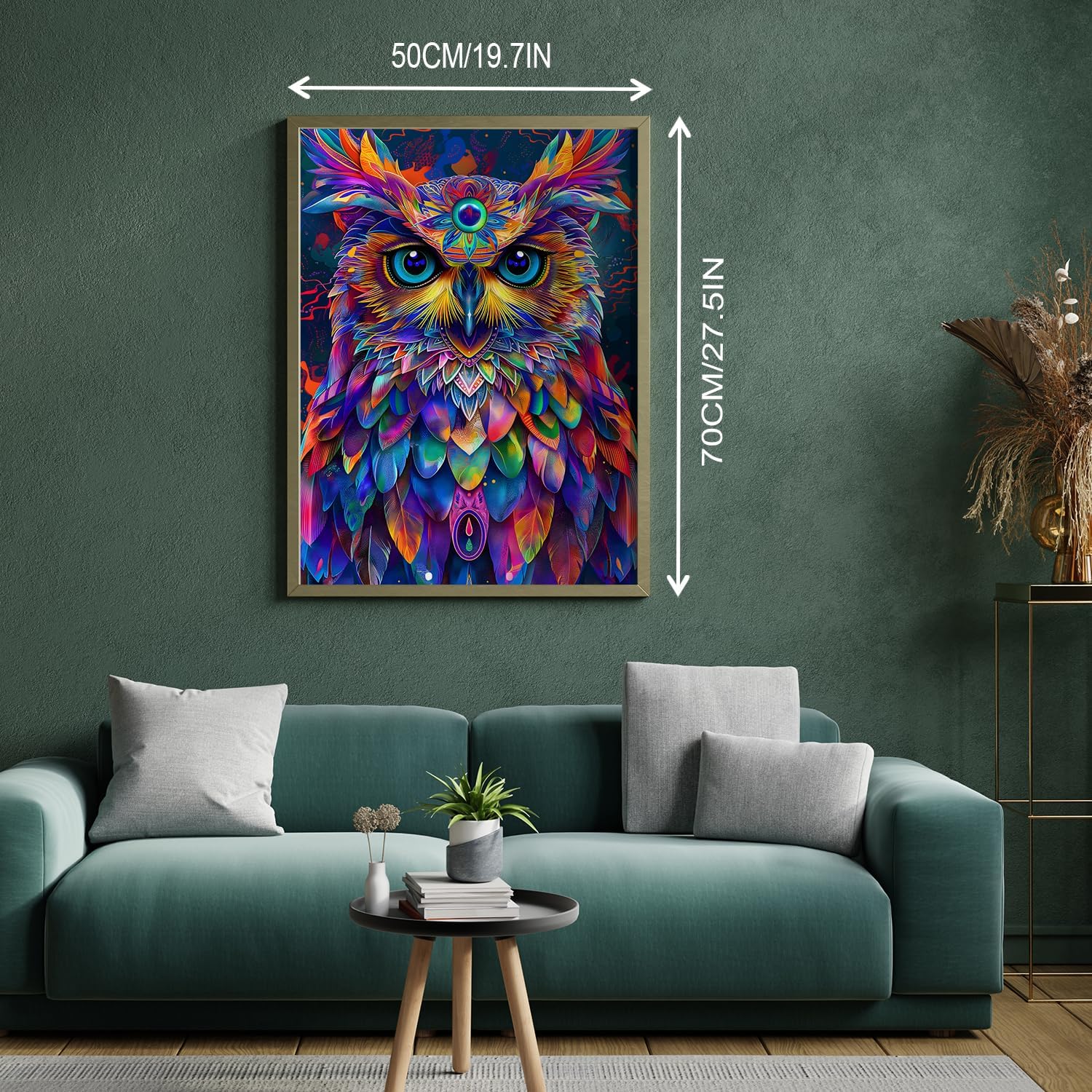 Lebendige Farbpalette : Die Federn der Eule sind in einer Reihe heller, neonartiger Farbtöne dargestellt, wobei jede Feder aufwendig gestaltet ist, um einen faszinierenden Effekt zu erzeugen, der den Betrachter in seinen Bann zieht.