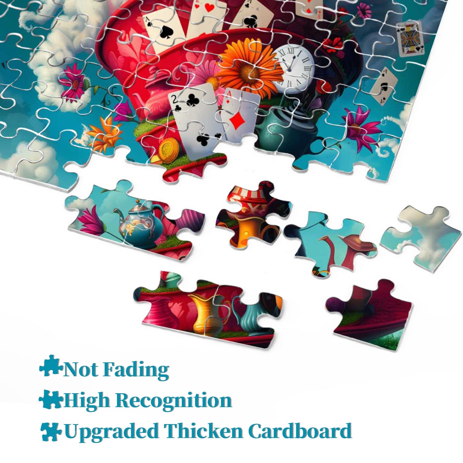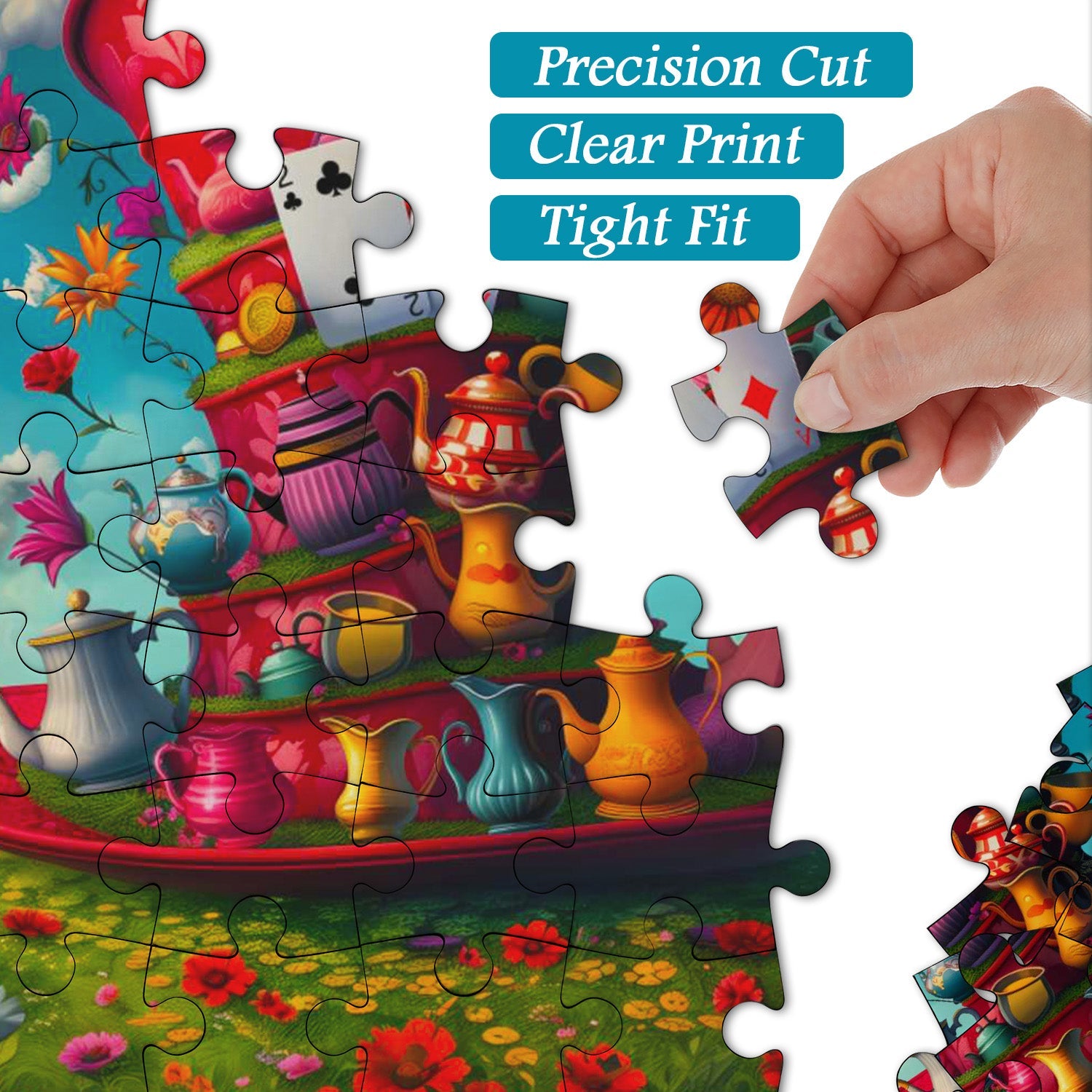 Playing Cards and Clock: Floating around and placed on the teacup structure are playing cards of different suits and a clock, adding a whimsical and fantastical touch.