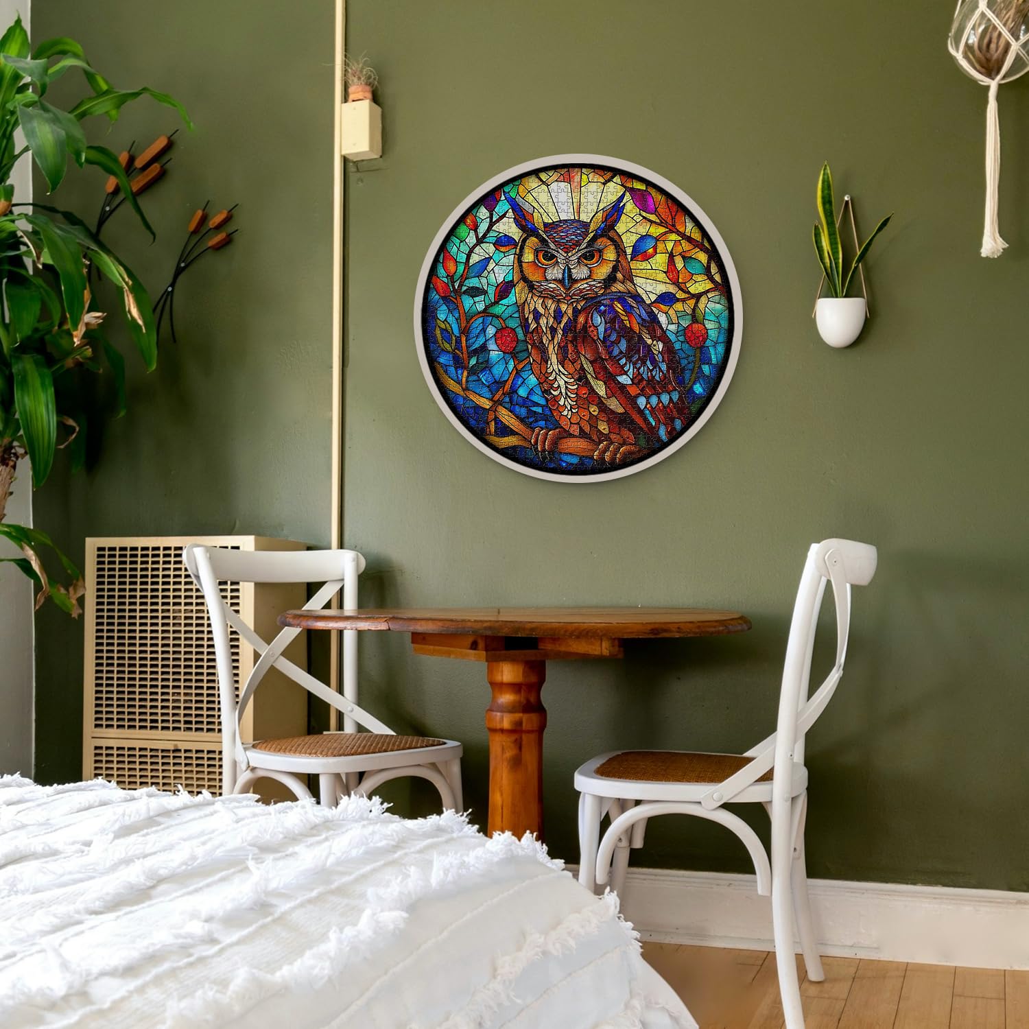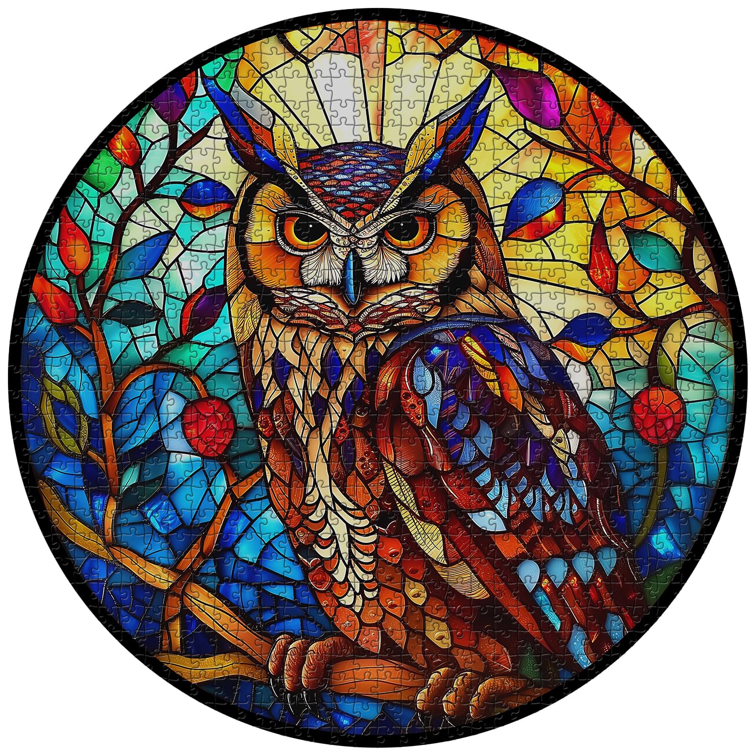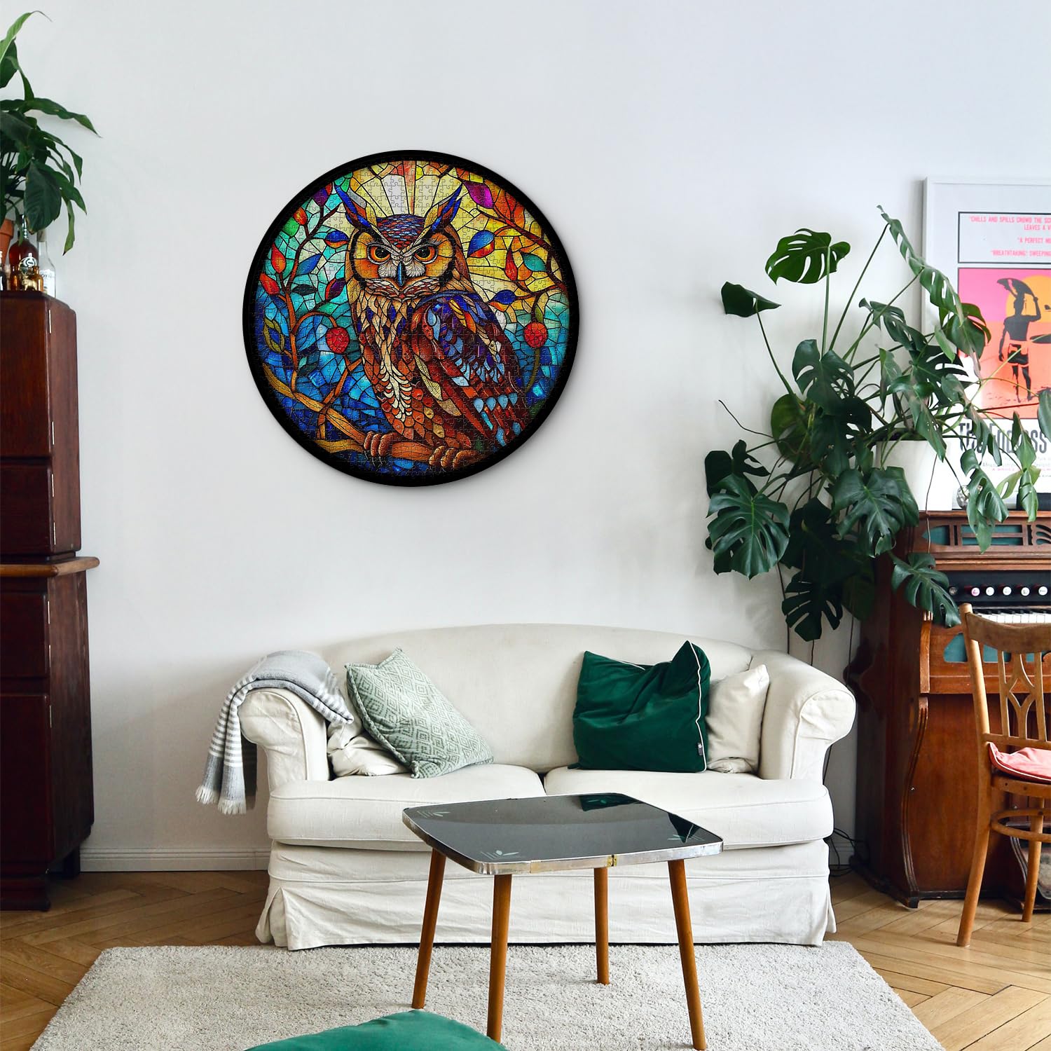 【Naturpuzzles für Vögel für Erwachsene】 Dieses runde Buntglaspuzzle mit 1000 Teilen zeigt eine wunderschöne Eule im Garten mit detaillierten Federn und scharfen Augen, die eine geheimnisvolle und fantasievolle Atmosphäre ausstrahlt. Die bunten Glasstücke sind wie eine wunderschöne Collage ineinander verschlungen und tragen zur Lebendigkeit und künstlerischen Atmosphäre der schwierigen Puzzles für Erwachsene bei.