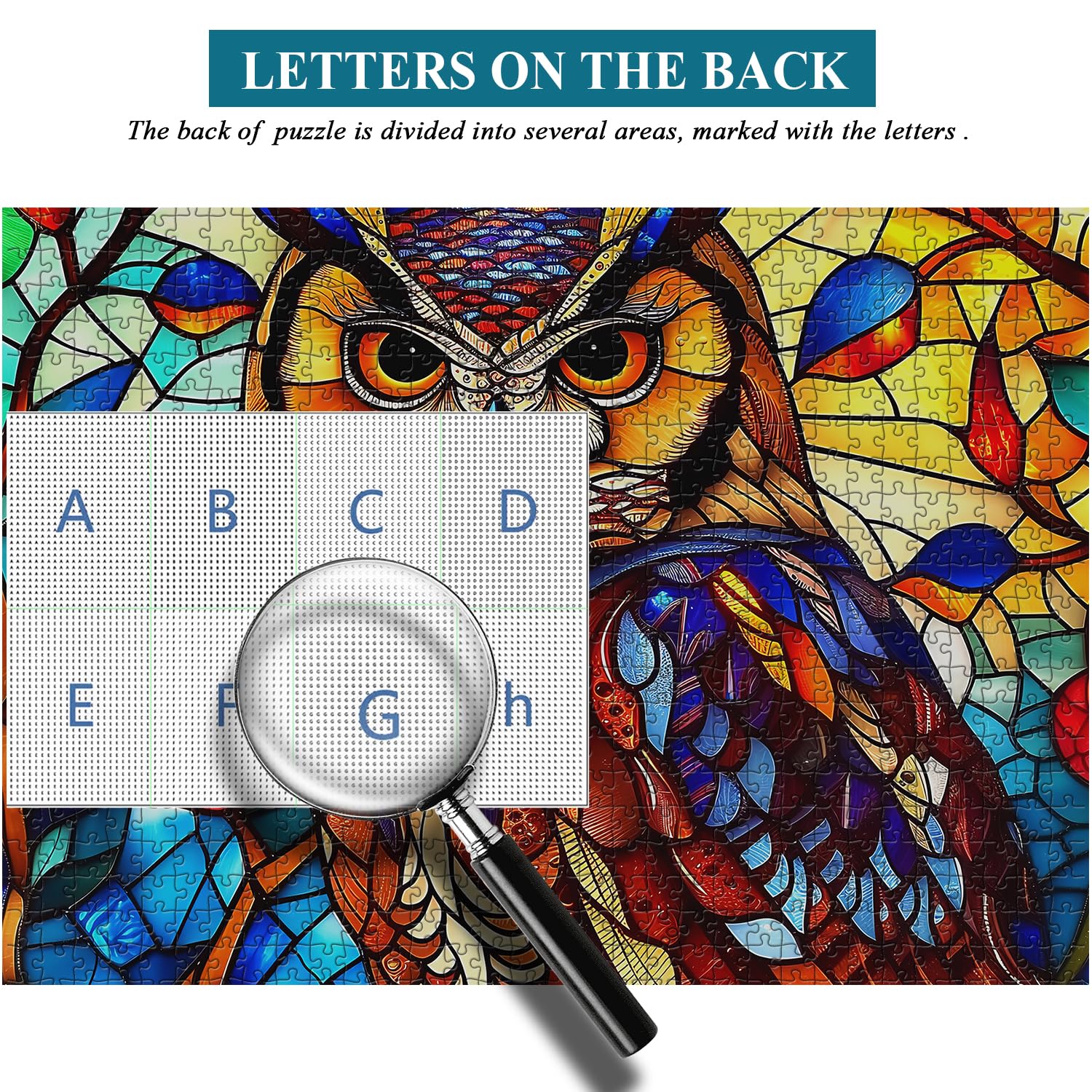 【Buchstabenmarkierung auf der Rückseite】 Die Rückseite des Eulen-Tierpuzzles für Erwachsene ist in mehrere Bereiche unterteilt, die mit den englischen Buchstaben „A“, „B“ usw. markiert sind. Dies erleichtert das bunte Eulen-Puzzle.