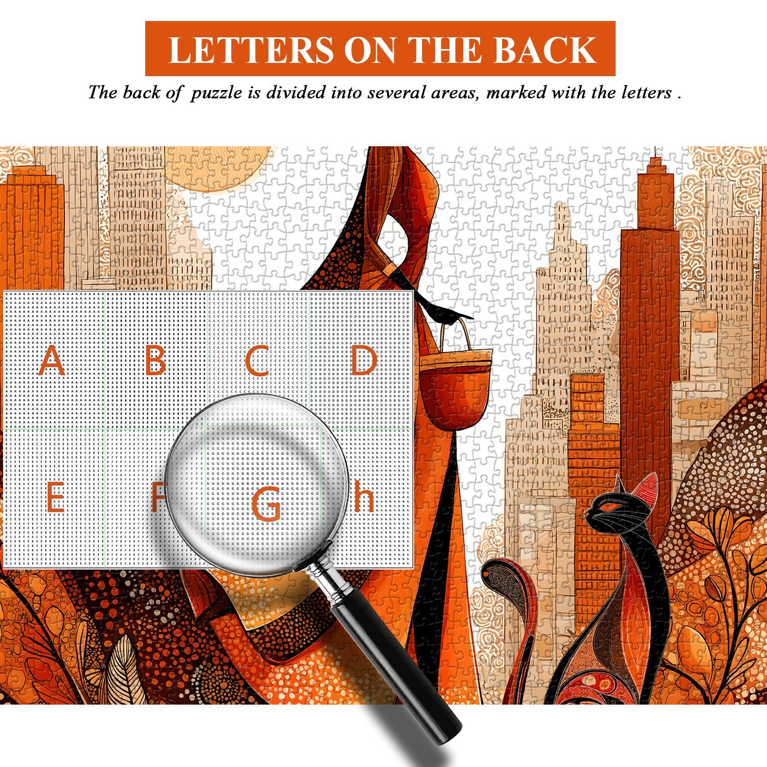 Vibrant Orange-Hued Art Style:Features a striking, warm-toned illustration of an elegant silhouetted woman in a wide-brimmed hat, set against a stylized city skyline, paired with a decorative cat and intricate dot-pattern textures for a sophisticated, eye-catching aesthetic.
