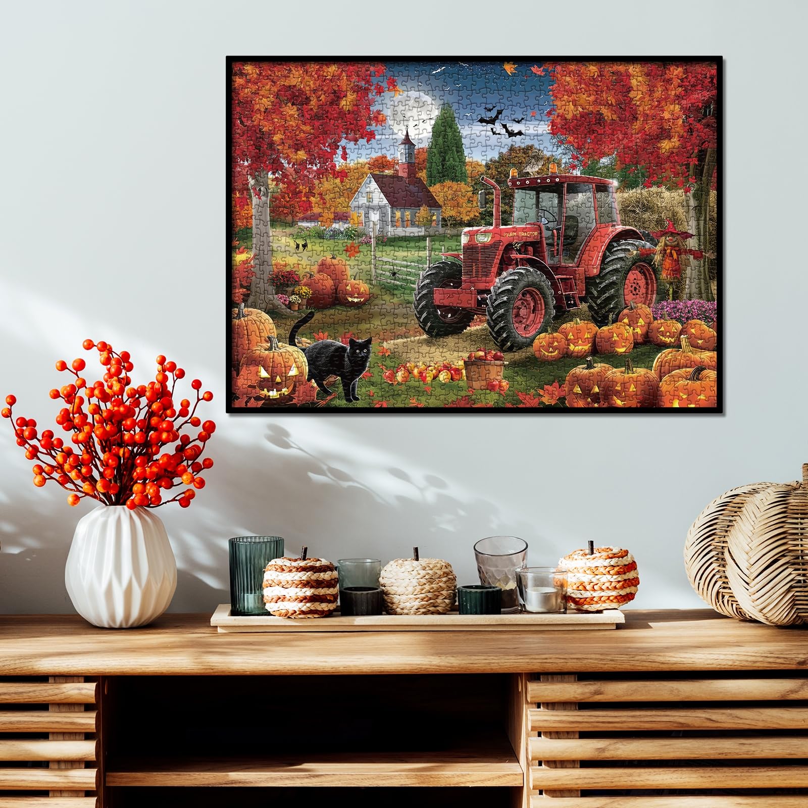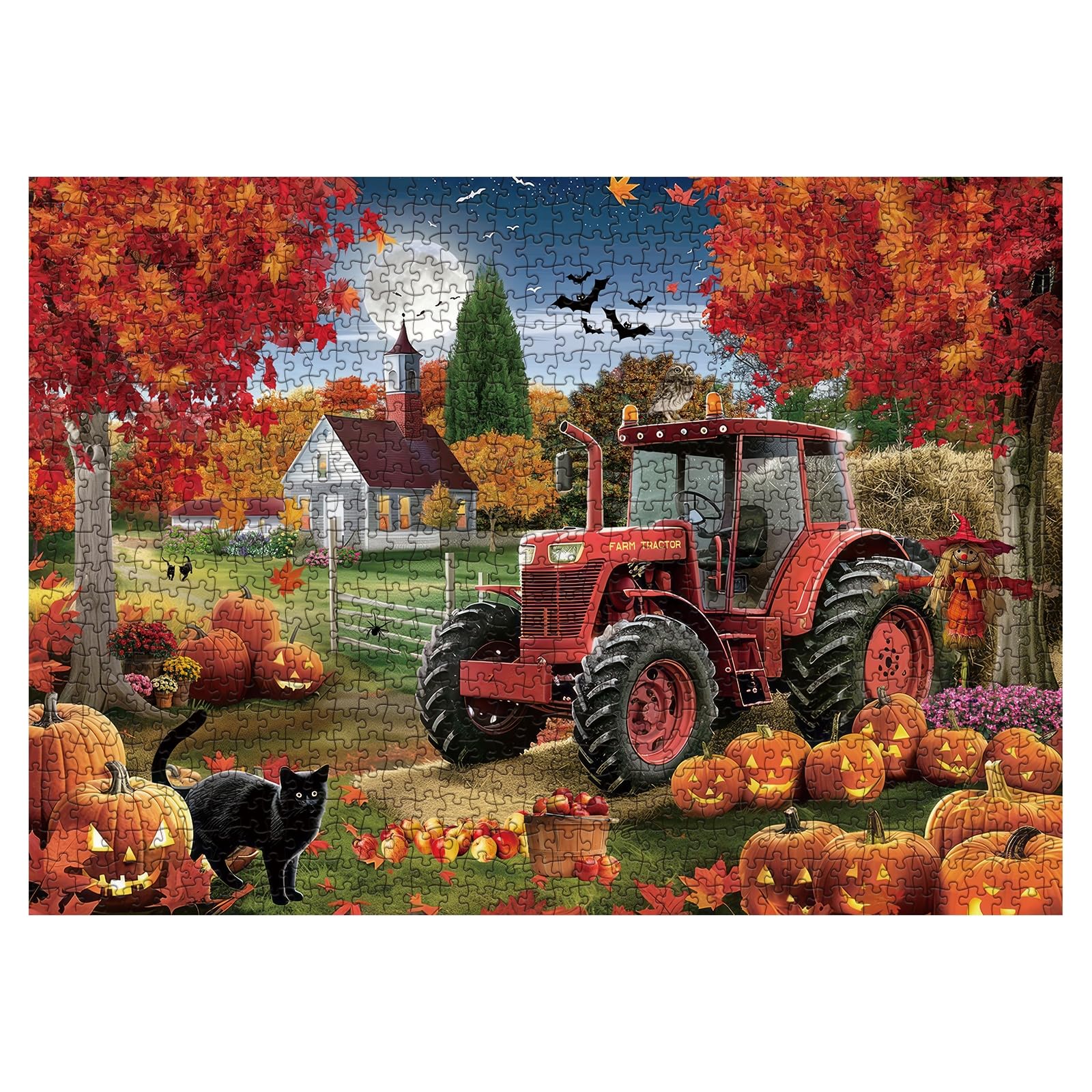 Autumn Harvest Puzzle: Embrace the Magic of Fall! Immerse yourself in the enchanting autumn night with our vibrant puzzle featuring a cozy estate, golden leaves, a red trailer, and bountiful pumpkins. Capture the essence of fall's rich harvest and bring the warmth of the season into your home!