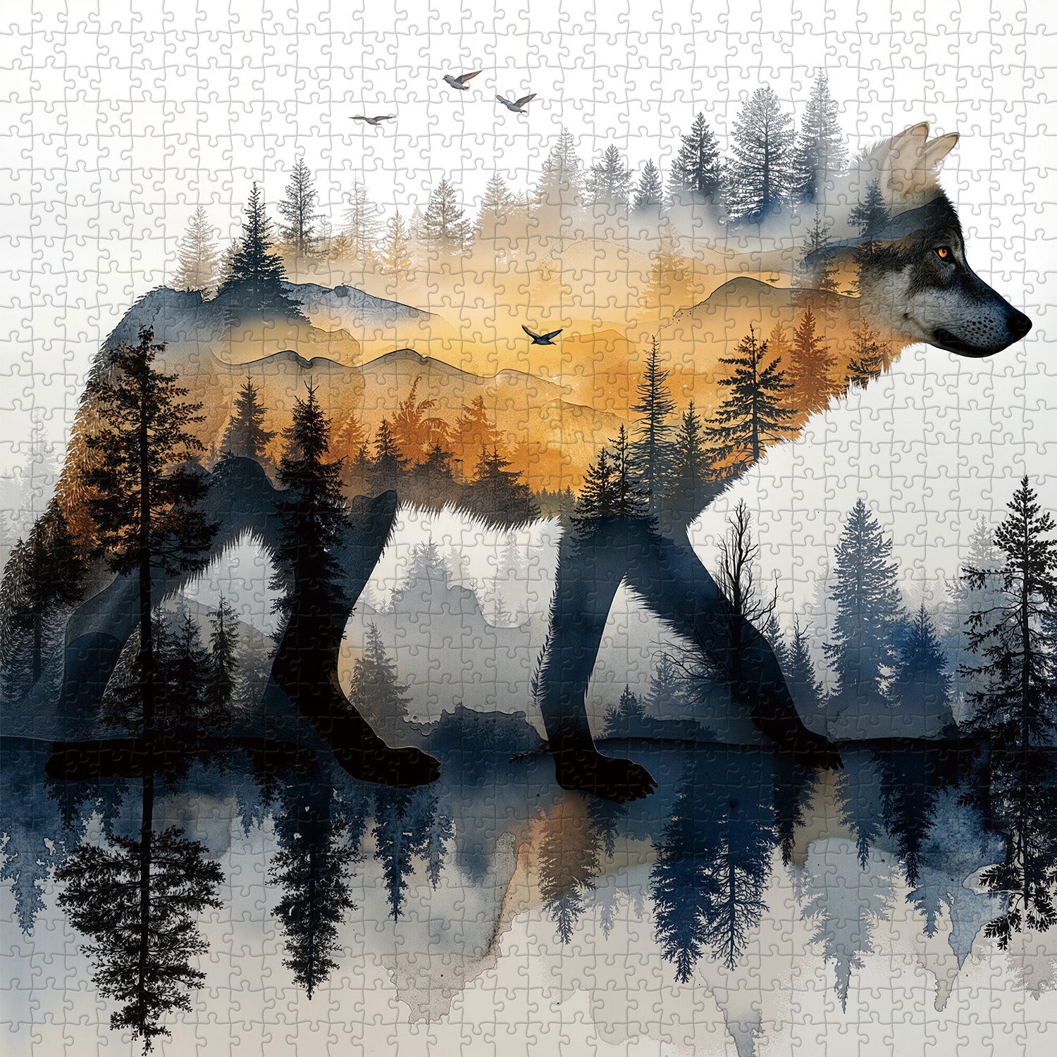 Double Exposure Wolf Silhouette:A majestic wolf walking gracefully, its body filled with a scenic blend of trees, mountains, and a glowing water reflection.