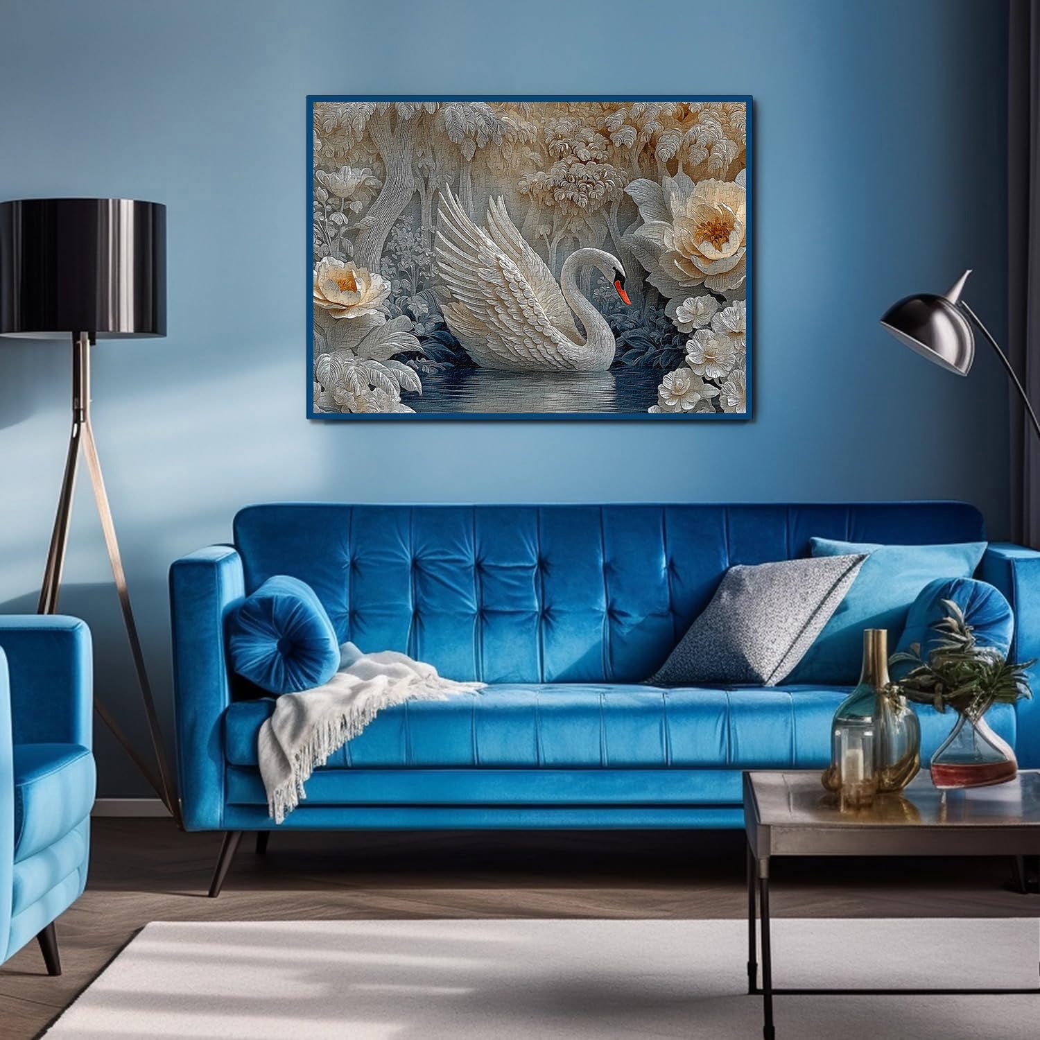 Floral Elements: Large, delicate flowers in shades of cream and beige, with detailed petals and textured centers, surround the swan and fill the scene.