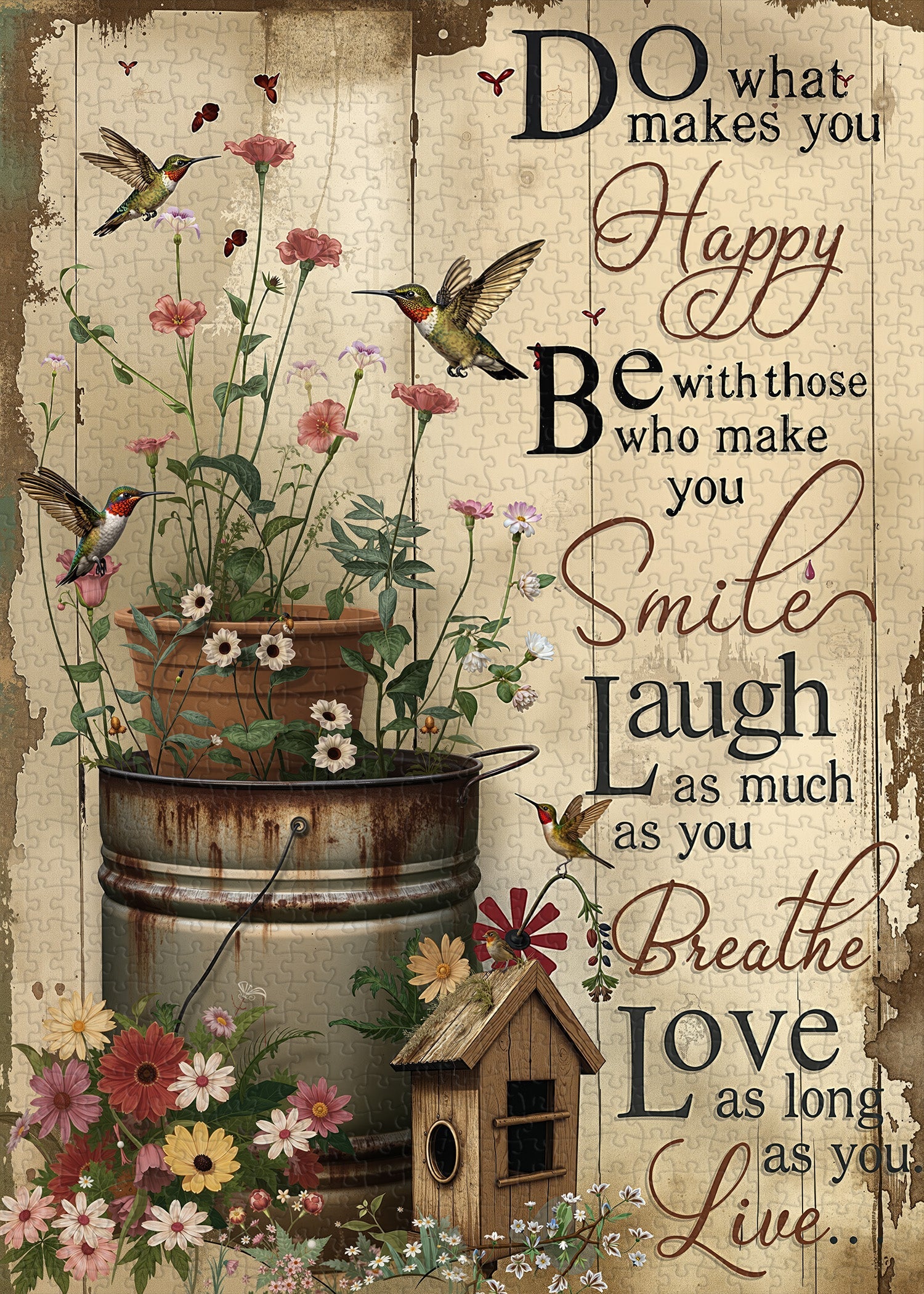 Quaint Birdhouse: A charming birdhouse sits beneath the flowerpot, creating a cozy, welcoming vibe that ties the scene together with a sense of simplicity and nature.