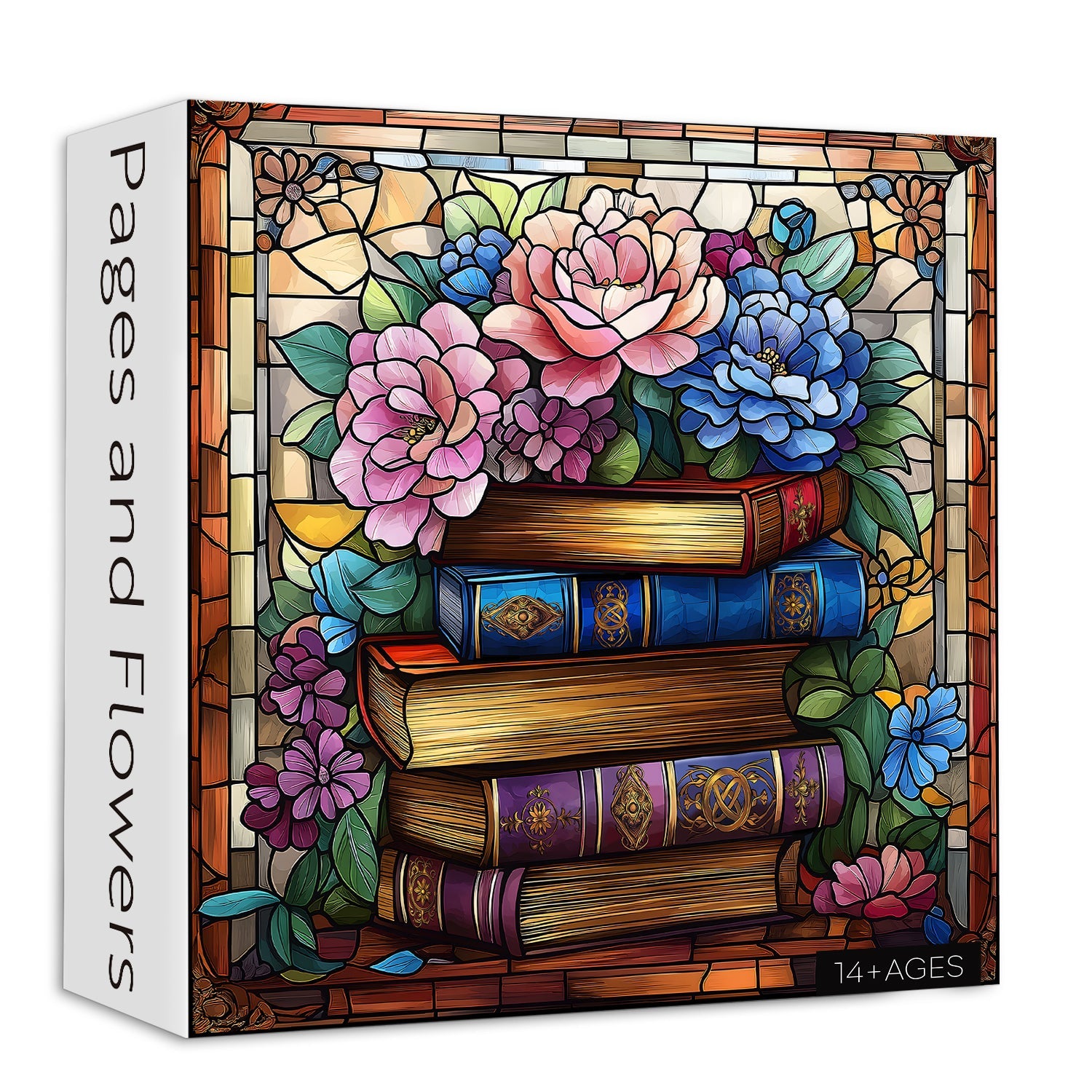 Design en vitrail Ce puzzle de 1000 pièces présente un magnifique design de style vitrail avec une pile de livres entourée de fleurs éclatantes en pleine floraison. Les détails riches et complexes ainsi que les couleurs vives créent une expérience visuelle captivante.