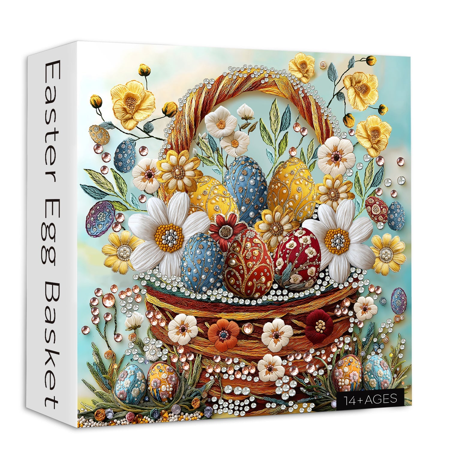 Panier d'œufs de Pâques : Un panier magnifiquement tissé trône au centre, débordant d'œufs de Pâques colorés. Chaque œuf est minutieusement orné de petits motifs floraux complexes et de perles, créant un spectacle éblouissant d'artisanat et d'élégance.