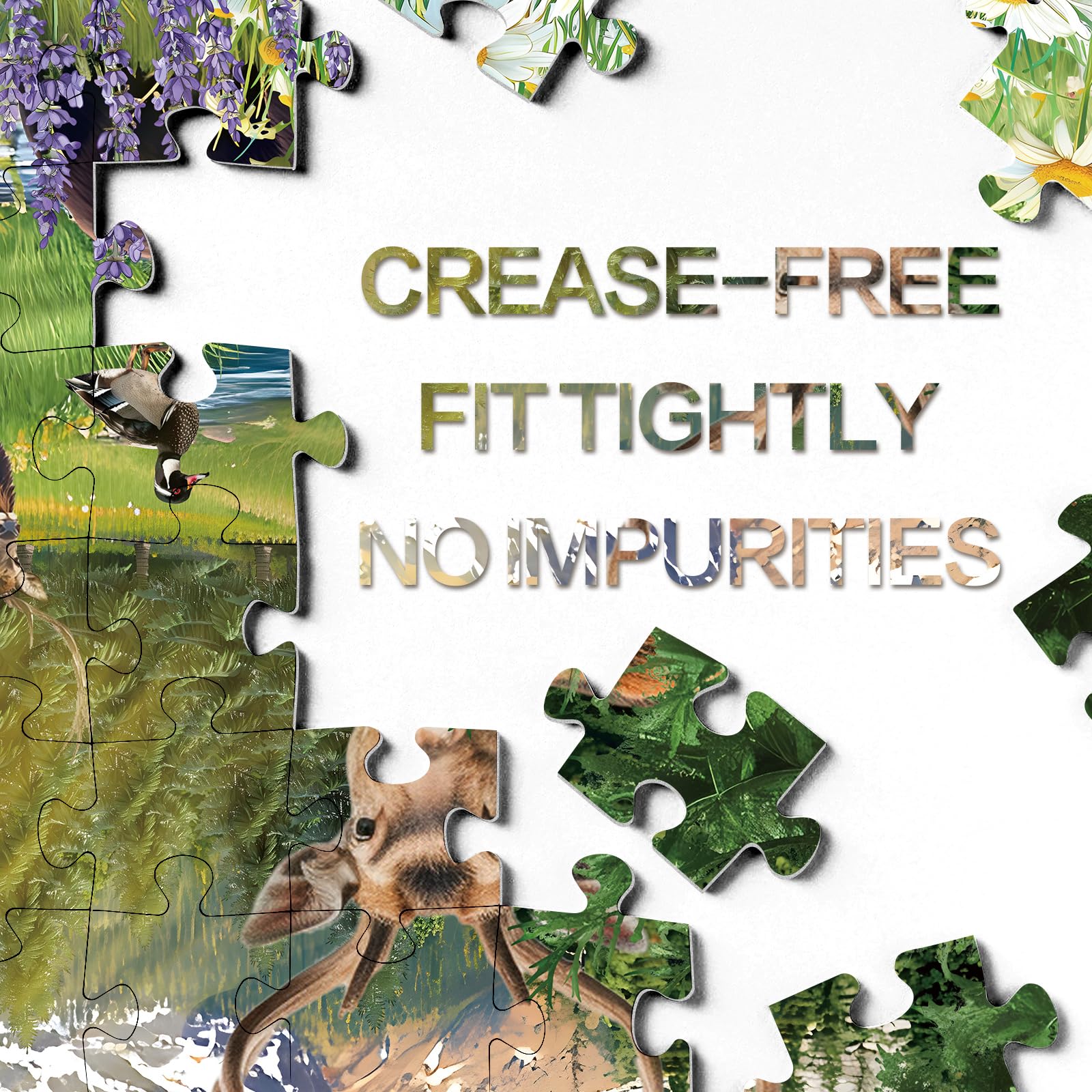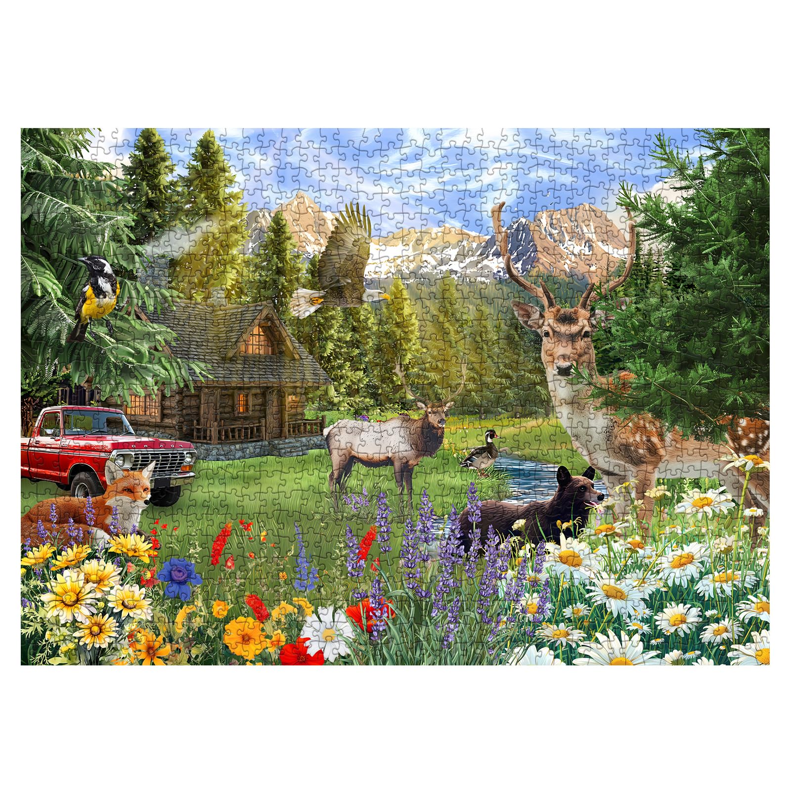Großes und beeindruckendes Design : Dieses Puzzle misst nach Fertigstellung 70 x 50 cm und bietet eine lebendige Frühlingswald-Jagdszene mit Hütte, Autos und malerischem Charme. Die Buchstabenkodierung auf der Rückseite sorgt für ein reibungsloses und angenehmes Zusammensetzen.