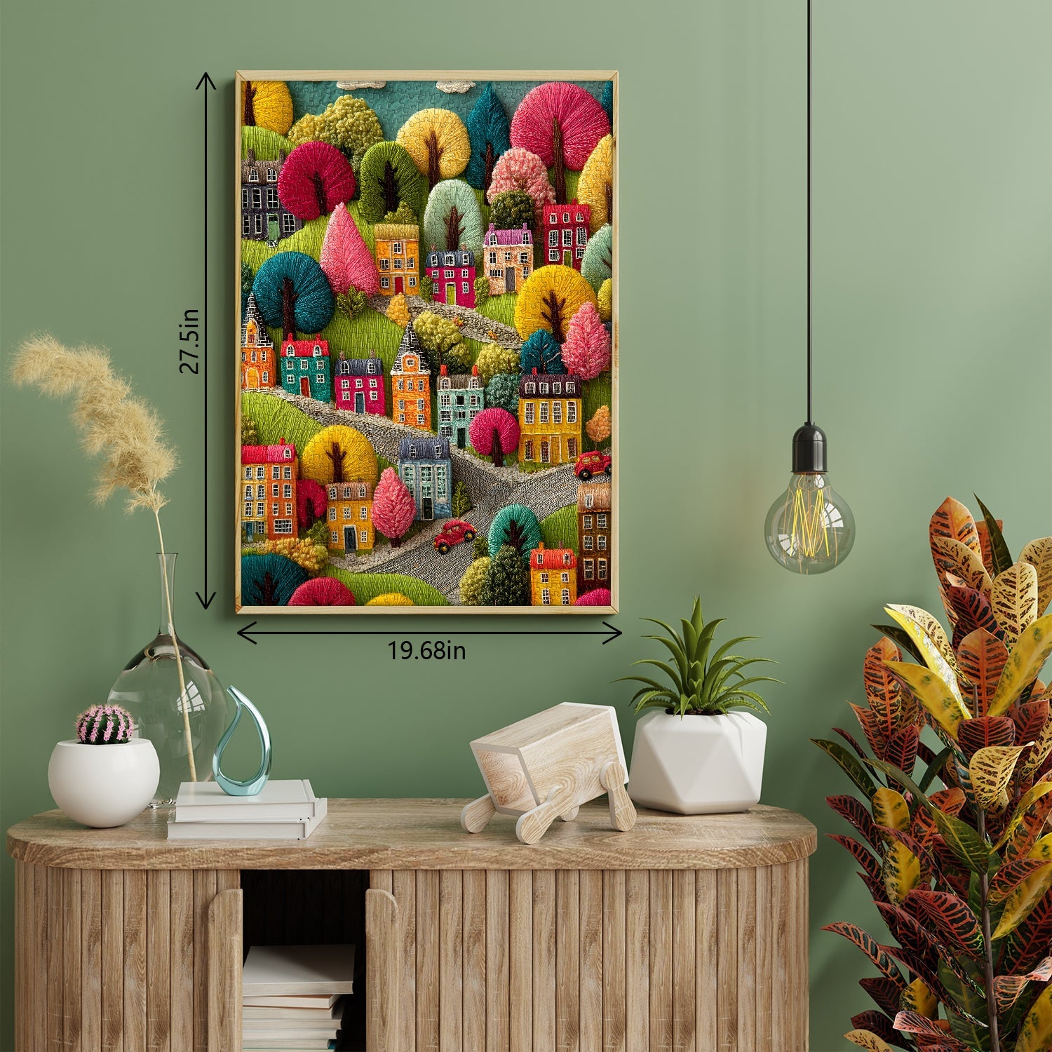 Embroidered Whimsical Village Design: Features a vibrant, textured scene of a colorful hillside village with hand-embroidered style houses, trees, and winding streets, creating a tactile, storybook aesthetic.