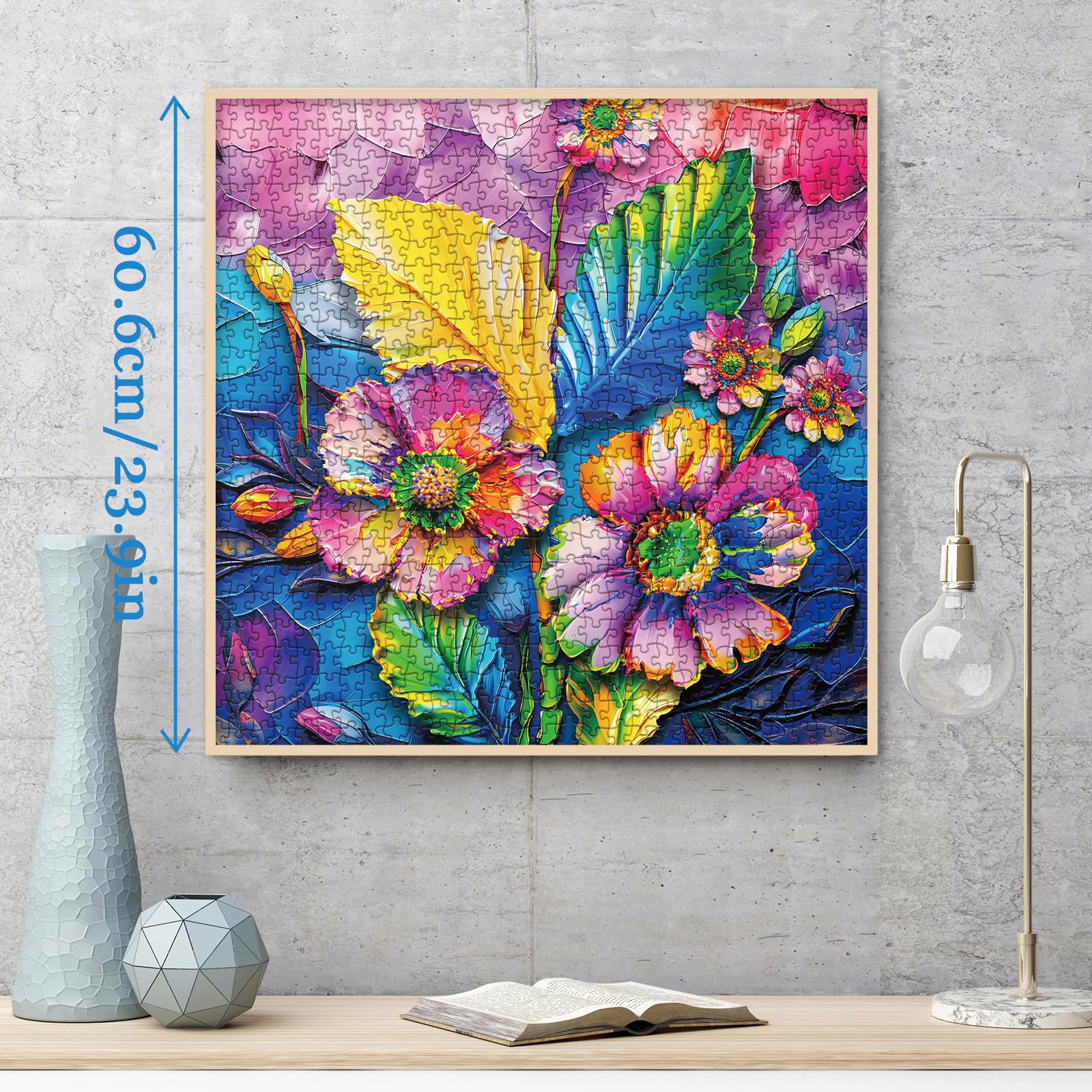 Easy & Enjoyable Assembly When completed, the 1000-piece adult puzzle measures 23 x 23 inches, 9.4 x 23.9 inches. Letter markings on the back make the assembly process seamless, allowing you to piece together your flower creation with ease