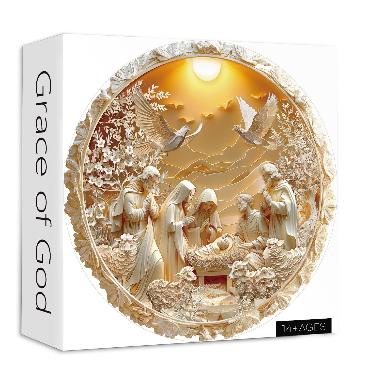 Œuvre d'art sacrée et détaillée Ce puzzle circulaire en relief exquis capture le moment divin de la naissance de Jésus, entouré d'anges et de spectateurs dévoués. Présentant Marie, Joseph et le bébé Jésus dans la crèche, la scène est baignée d'une lumière dorée chaleureuse, symbolisant la grâce divine et l'amour.