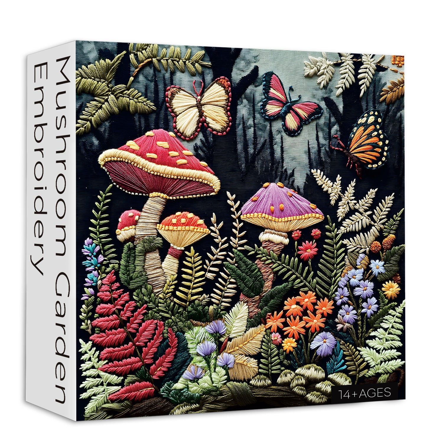 Design de broderie élégant: Ce puzzle capture la beauté d'une scène finement brodée sur un tissu foncé, mettant en valeur une composition inspirée de la forêt avec des champignons, des fougères et des papillons. Les détails minutieux de la couture révèlent une esthétique riche et artisanale, donnant l'impression d'une véritable œuvre d'art brodée.
