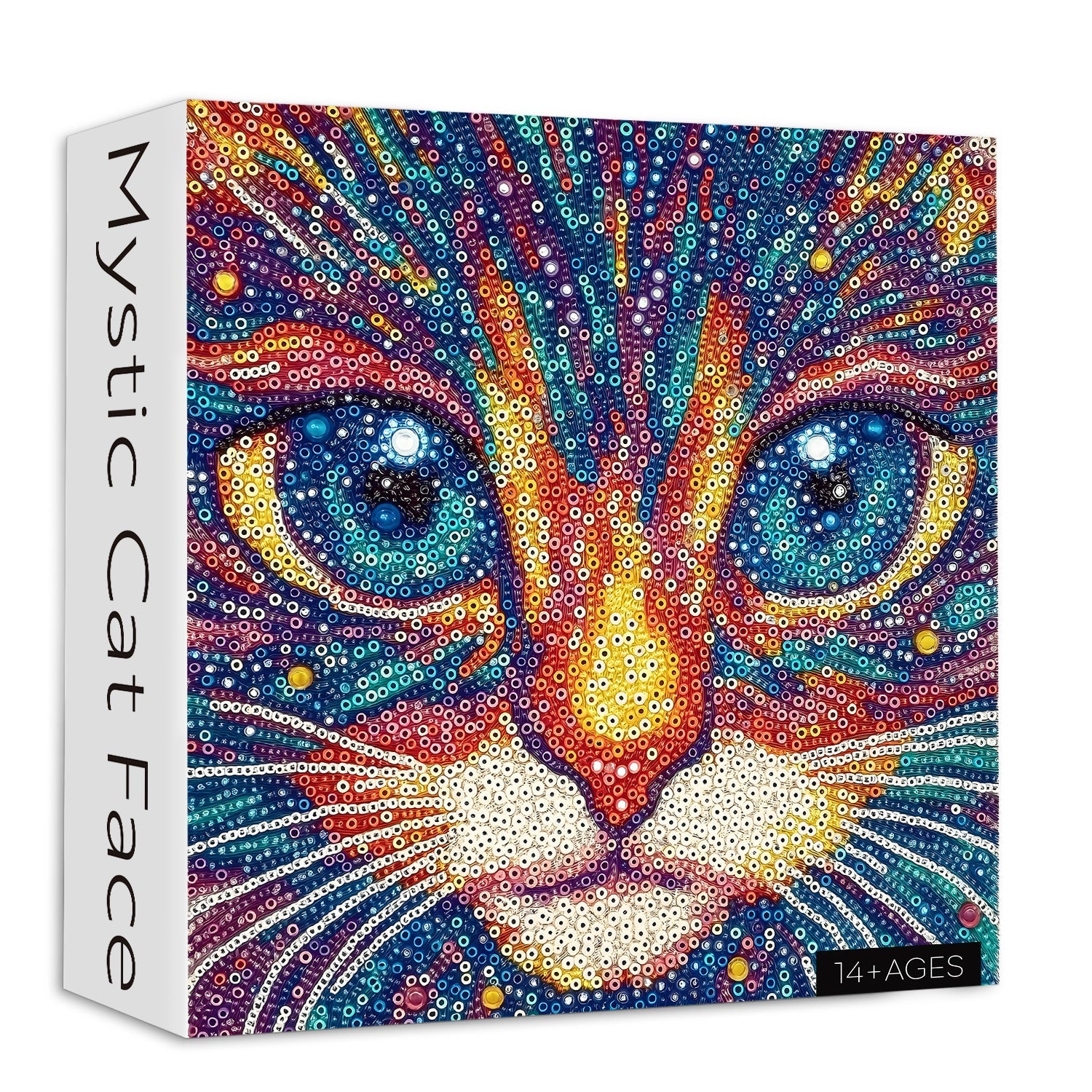 Fond de mosaïque orné de perles complexes : Autour du visage de chat se trouve une mosaïque colorée composée de petites perles. Les perles sont méticuleusement disposées pour former des motifs complexes qui rayonnent vers l'extérieur, complétant le visage de chat pailleté tout en créant un arrière-plan riche et texturé.