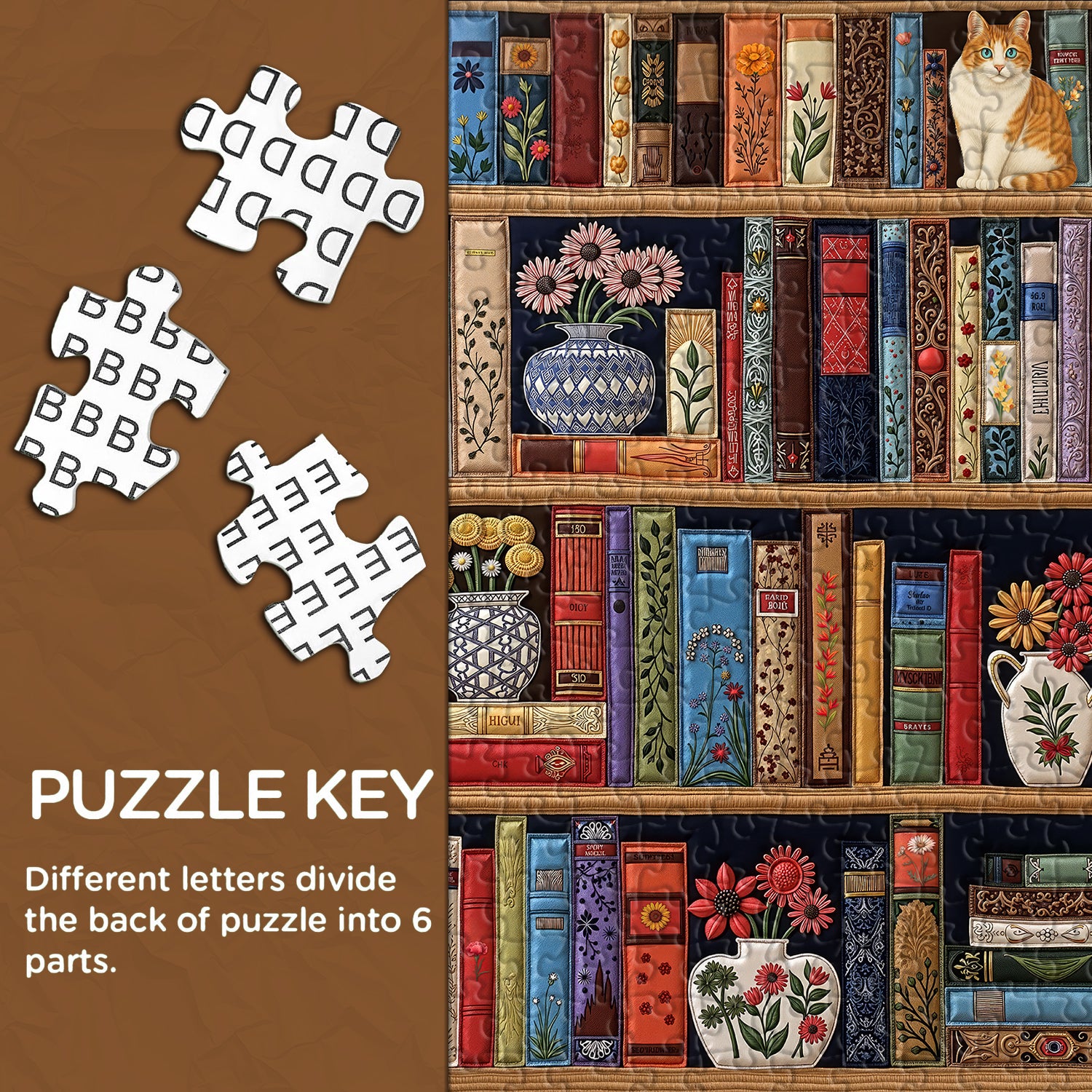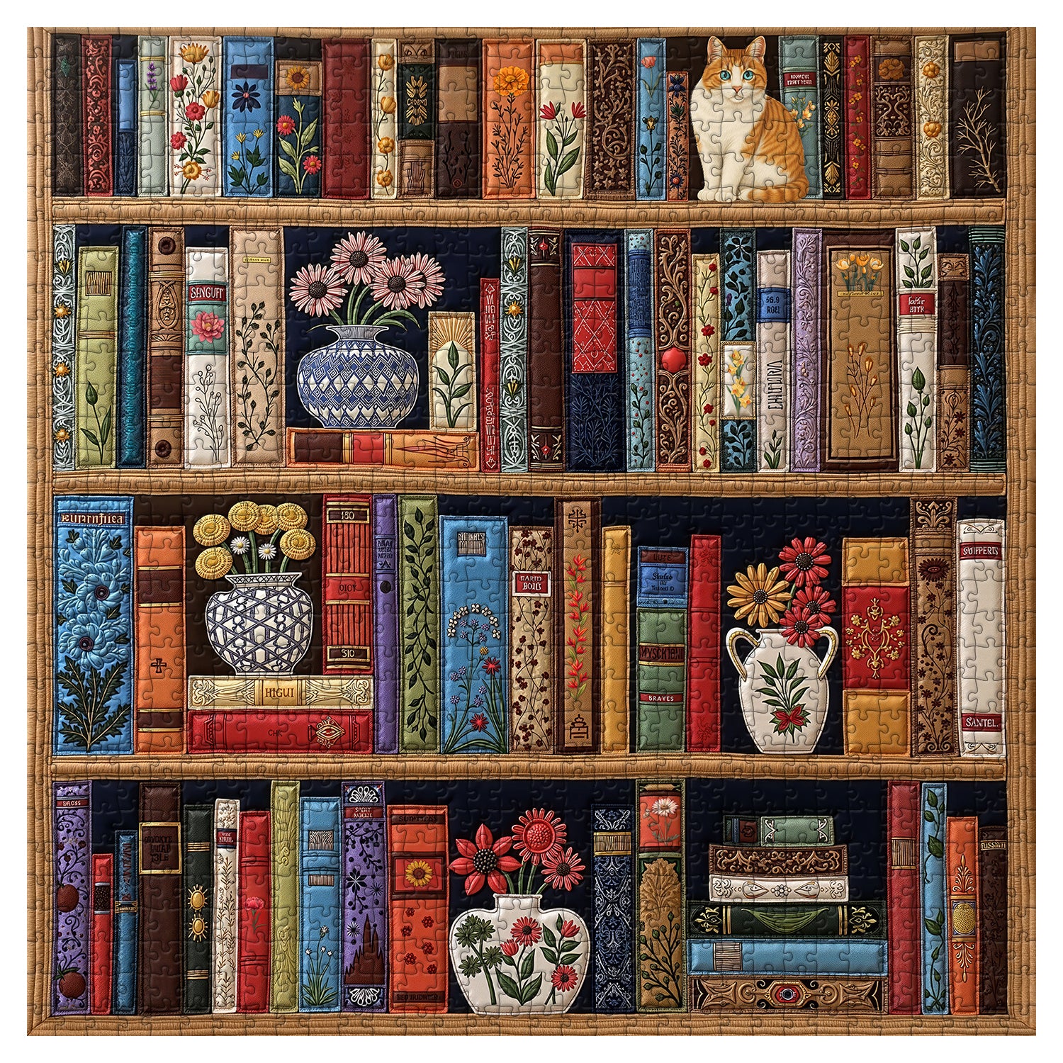 Whimsical Cat & Floral Library Artwork Enjoy assembling this unique puzzle featuring a charming orange tabby cat perched on a bookshelf, surrounded by colorful vintage books and vibrant floral designs that add elegance and warmth to any space.