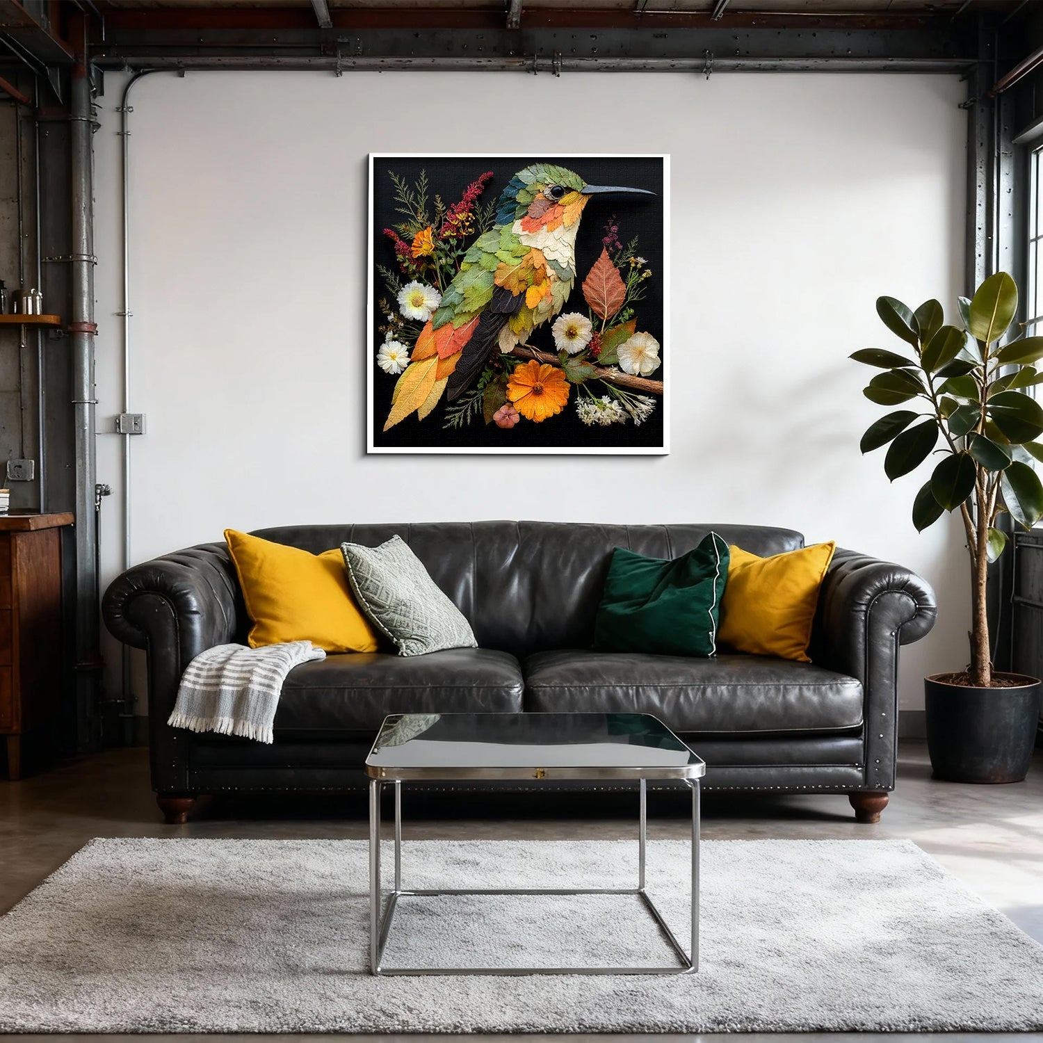 Nature-Infused Art Style: The piece blends natural materials (leaves, flowers) with artistic design, resulting in a whimsical, eco-friendly aesthetic that celebrates both the bird and botanical elements.