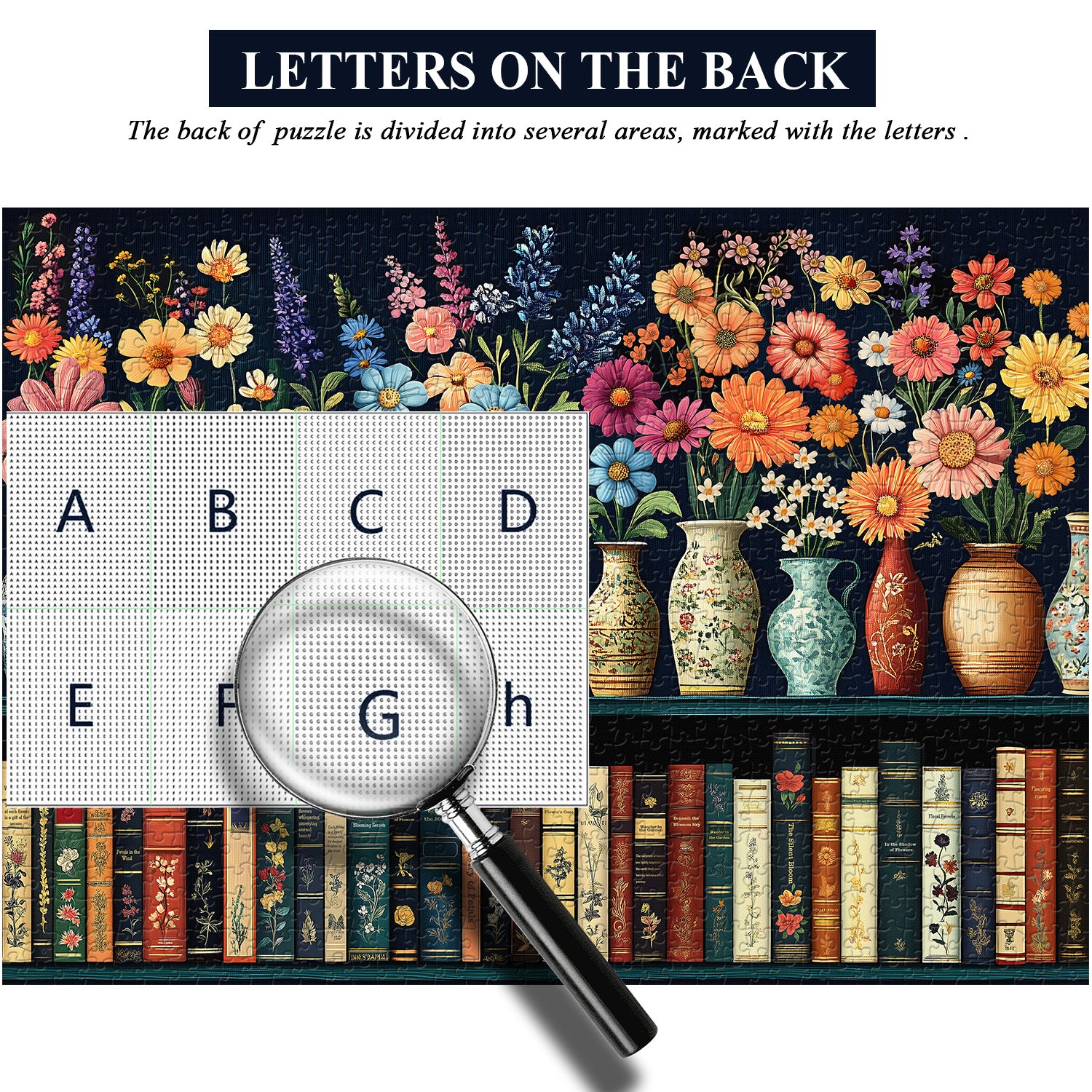 A Perfect Blend of Books and Flowers:This 1000-piece puzzle features a stunning composition of bookshelves filled with books, each adorned with vibrant floral patterns. The combination of books and colorful flowers creates a mesmerizing and enchanting visual.