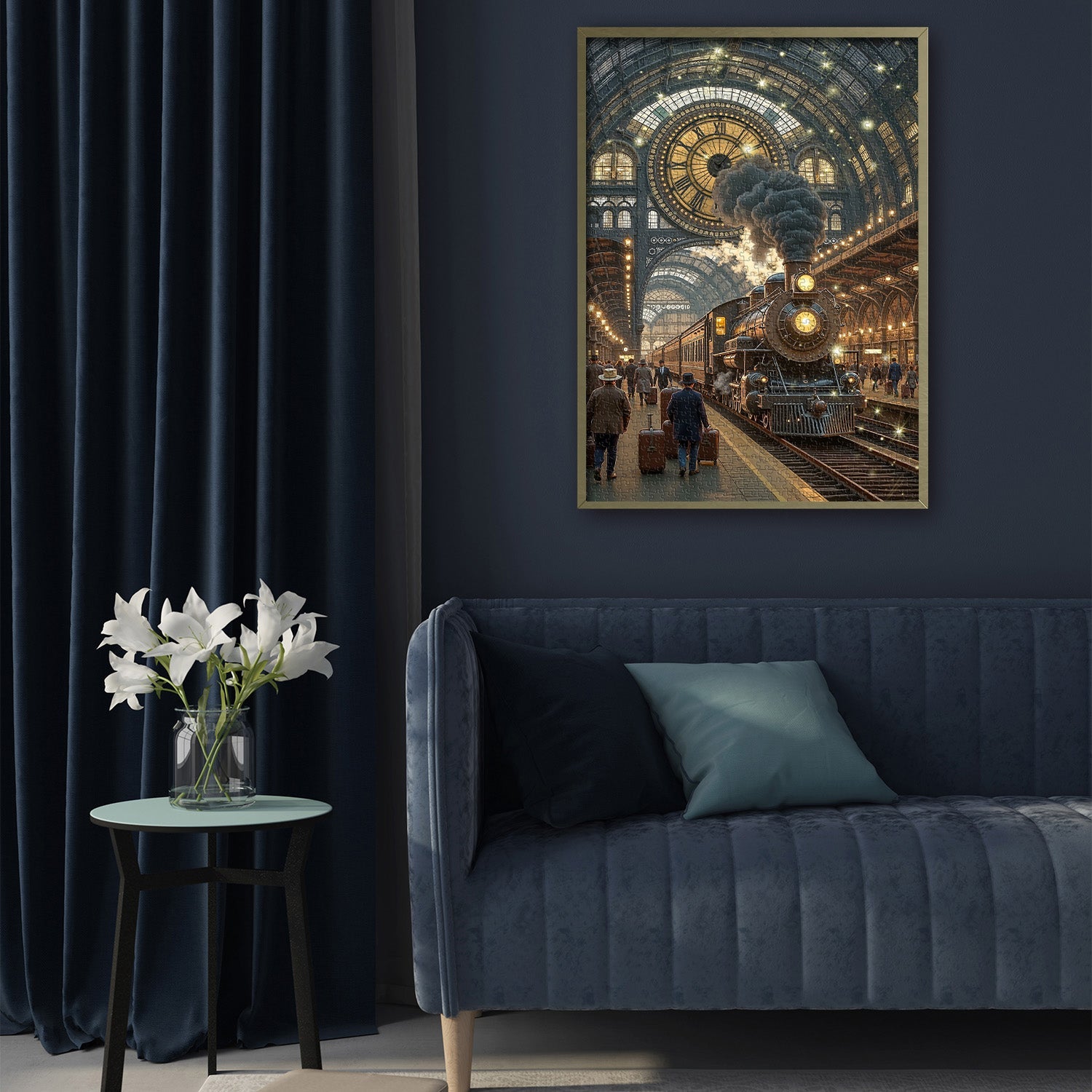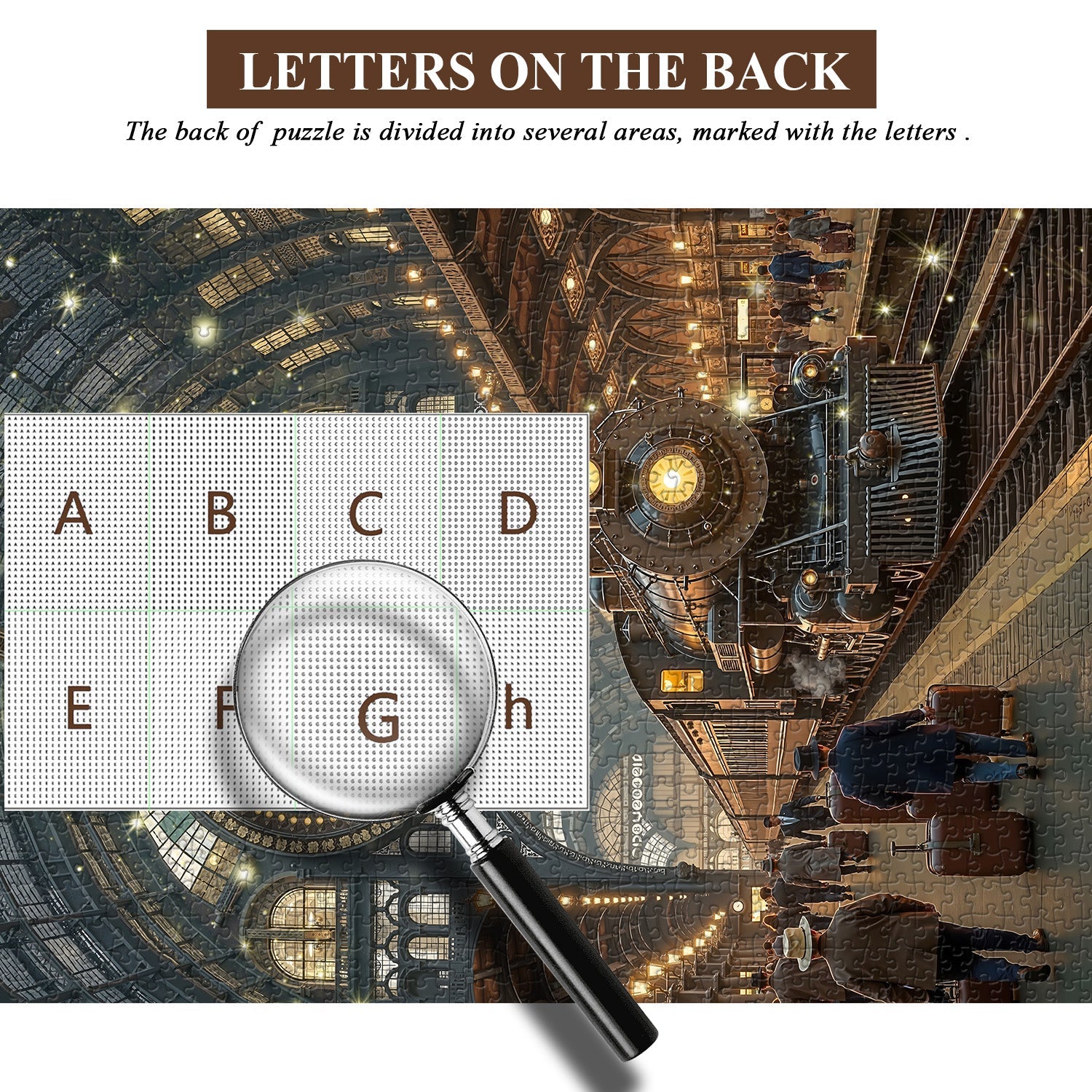 ⚙️🧍Key Elements: Features a detailed steam locomotive, a massive antique clock, arched glass ceilings, and period-dressed travelers, all rendered with intricate puzzle piece details.