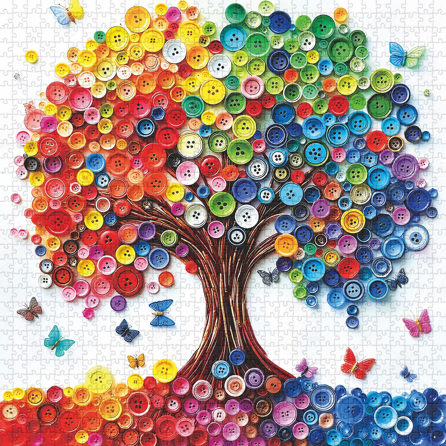 Unique Button Art Design Bring home the vibrant beauty of a tree made entirely of colorful buttons and fluttering butterflies, adding artistic charm to your puzzle time.