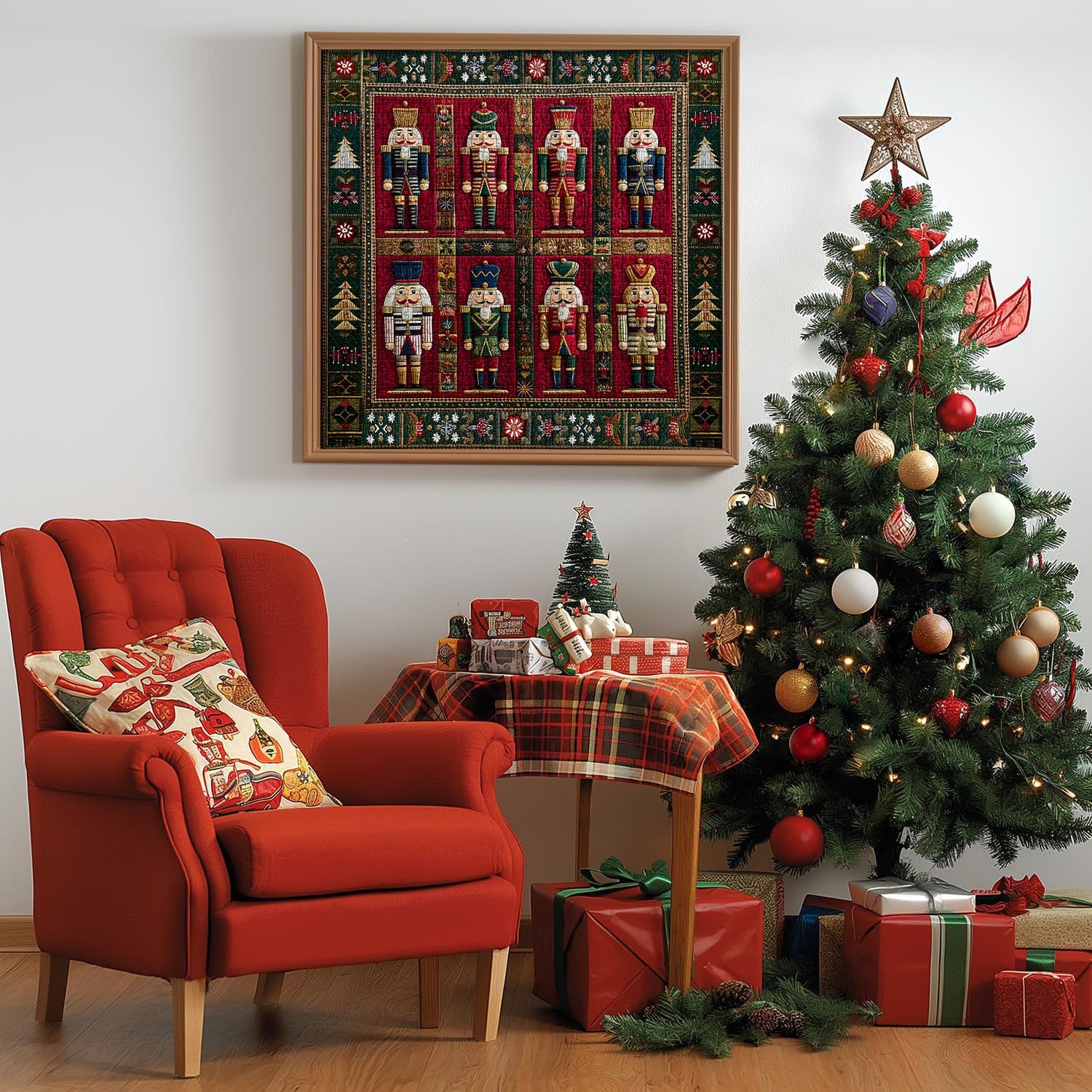 Exquisite Nutcracker Design: Features 8 intricately embroidered nutcracker soldiers in vibrant red, green, blue and gold uniforms, each with unique crowns and facial expressions, set against a richly patterned quilted background with festive elements like Christmas trees and snowflakes.