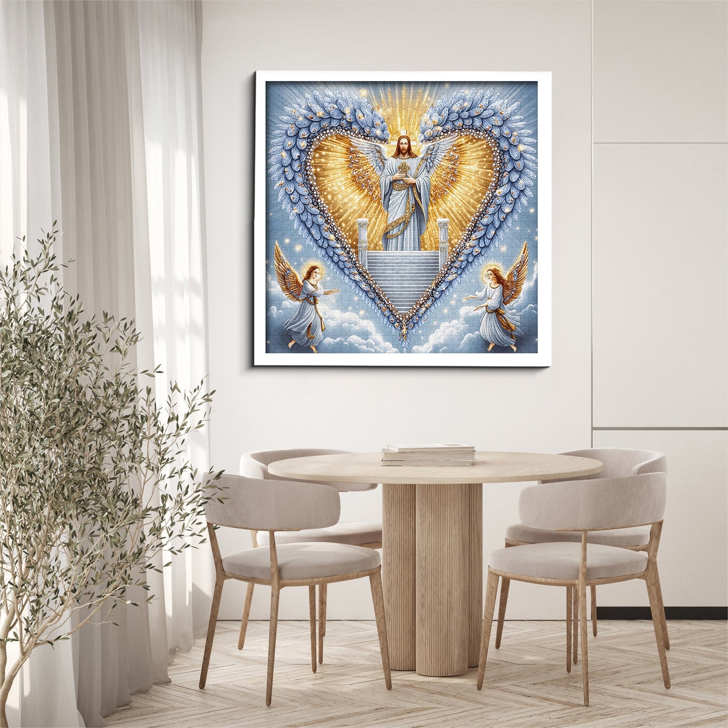 ivine Sacred Art Design: A breathtaking religious-themed illustration centered on a radiant figure of Jesus, framed by an ornate heart-shaped wreath of blue feathers and golden light, flanked by two angels. The ethereal sky and celestial details create a serene, uplifting visual experience.