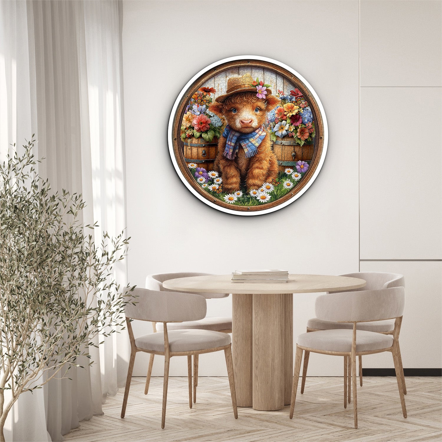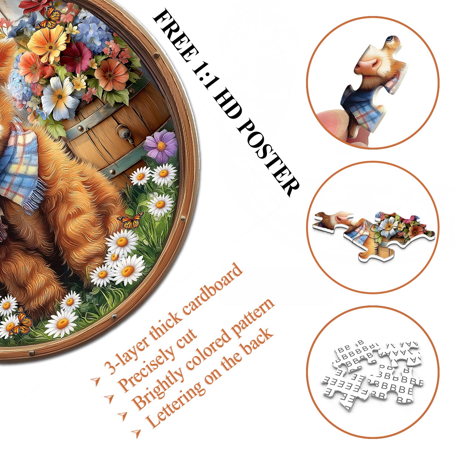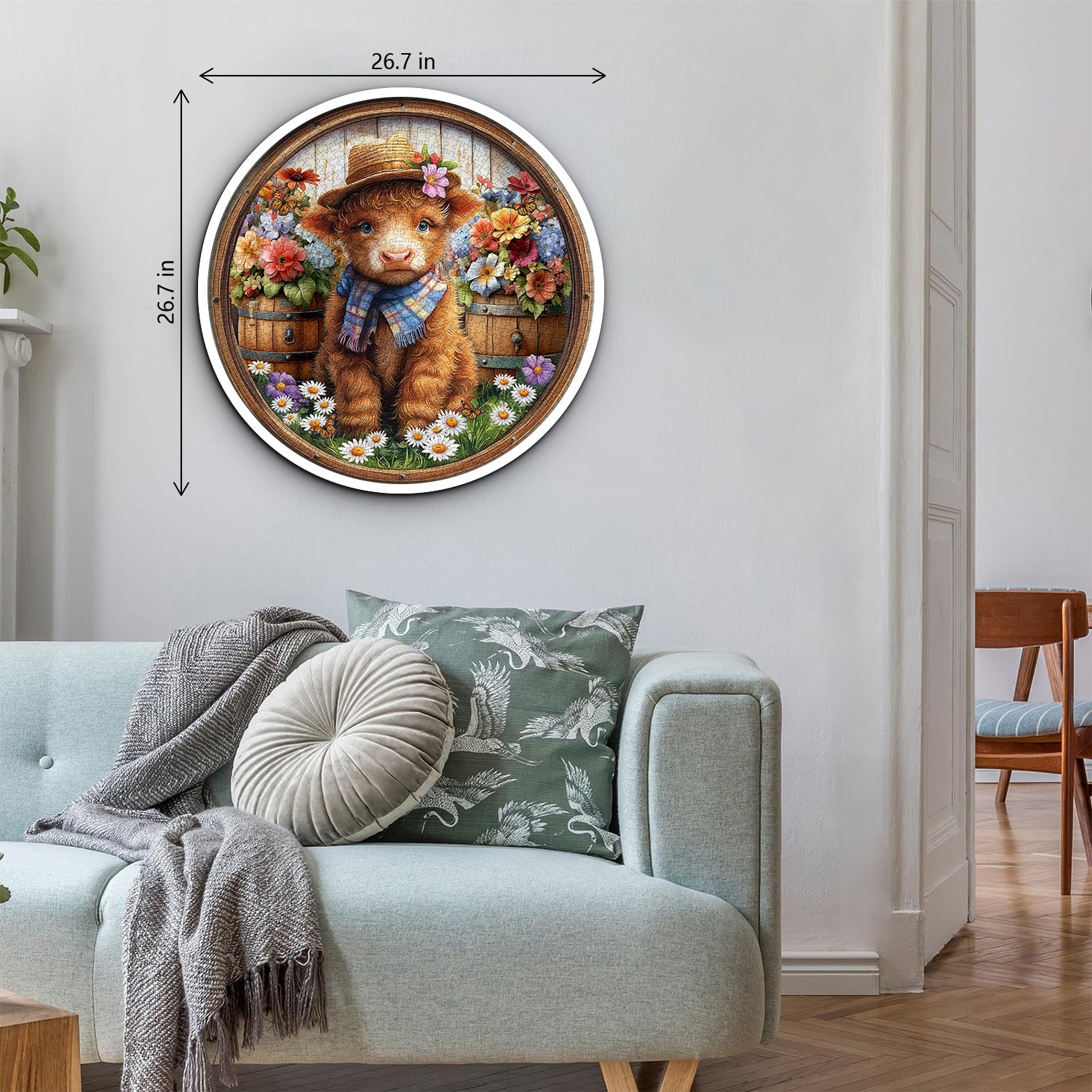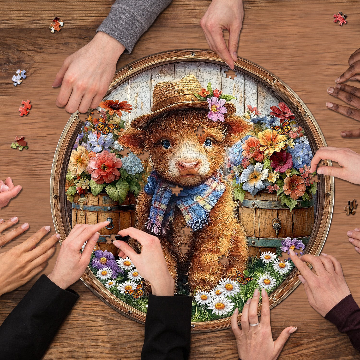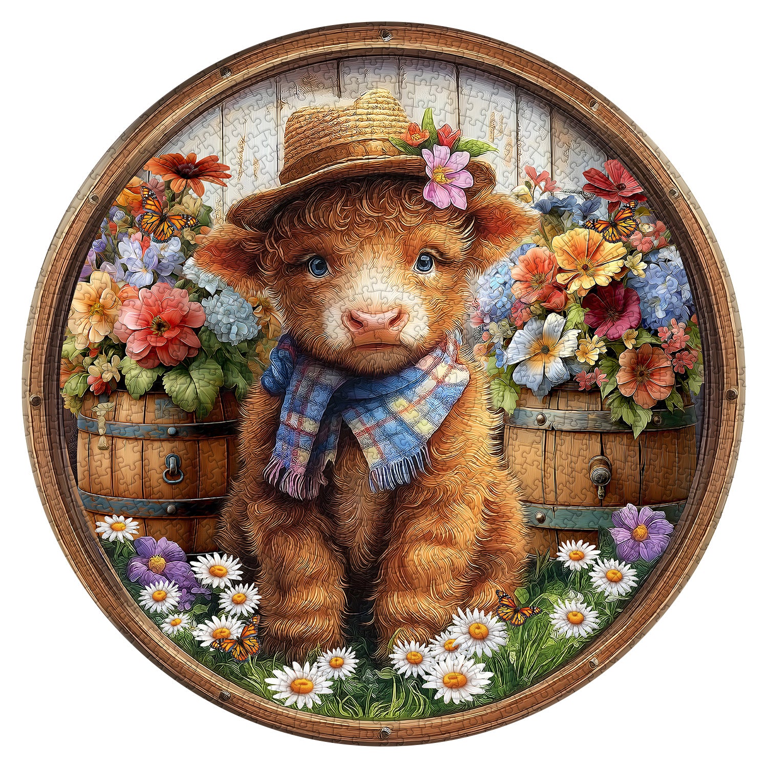 Adorable Floral Calf Design Enjoy assembling this heartwarming puzzle featuring a fluffy baby calf wearing a straw hat and plaid scarf, surrounded by vibrant garden flowers and butterflies.