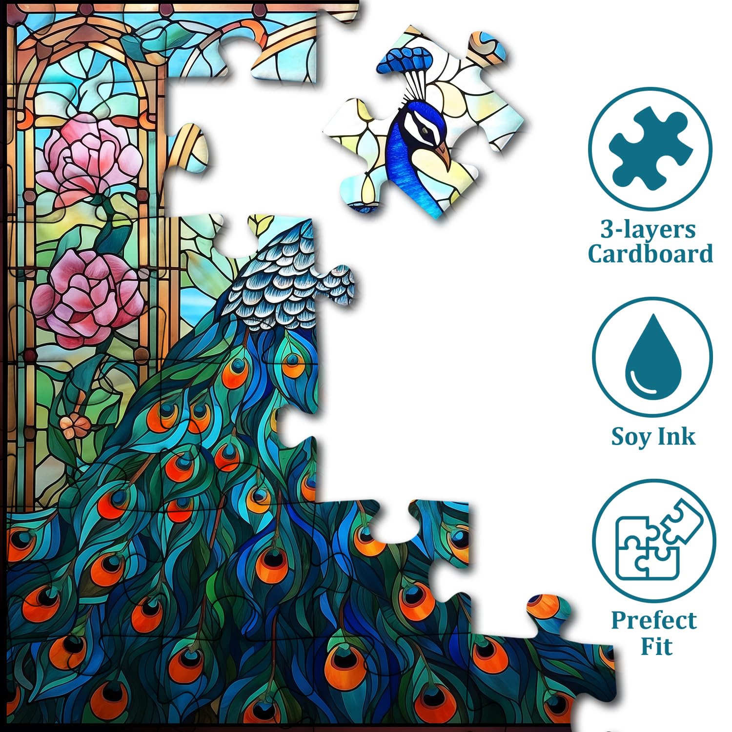 【Well-made】The bird jigsaw puzzle stained glass are made of recyclable three-layer cardboard and preciely cut for a snug fit. Peacock flower garden puzzles for adults 1000 piece challenging features high resolution, matte finish and smooth edging.